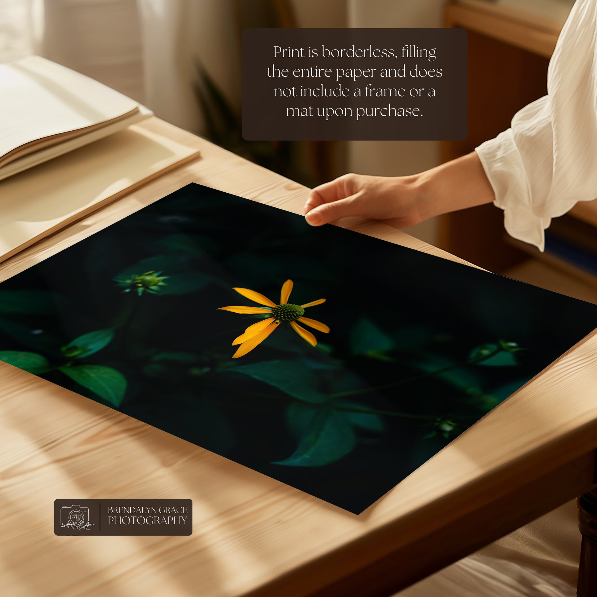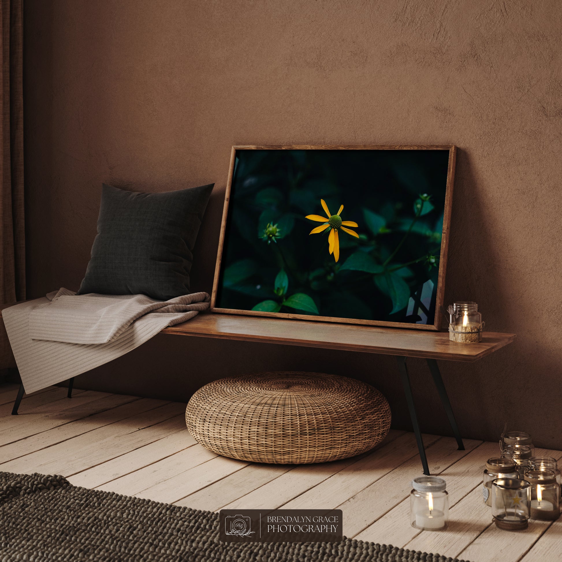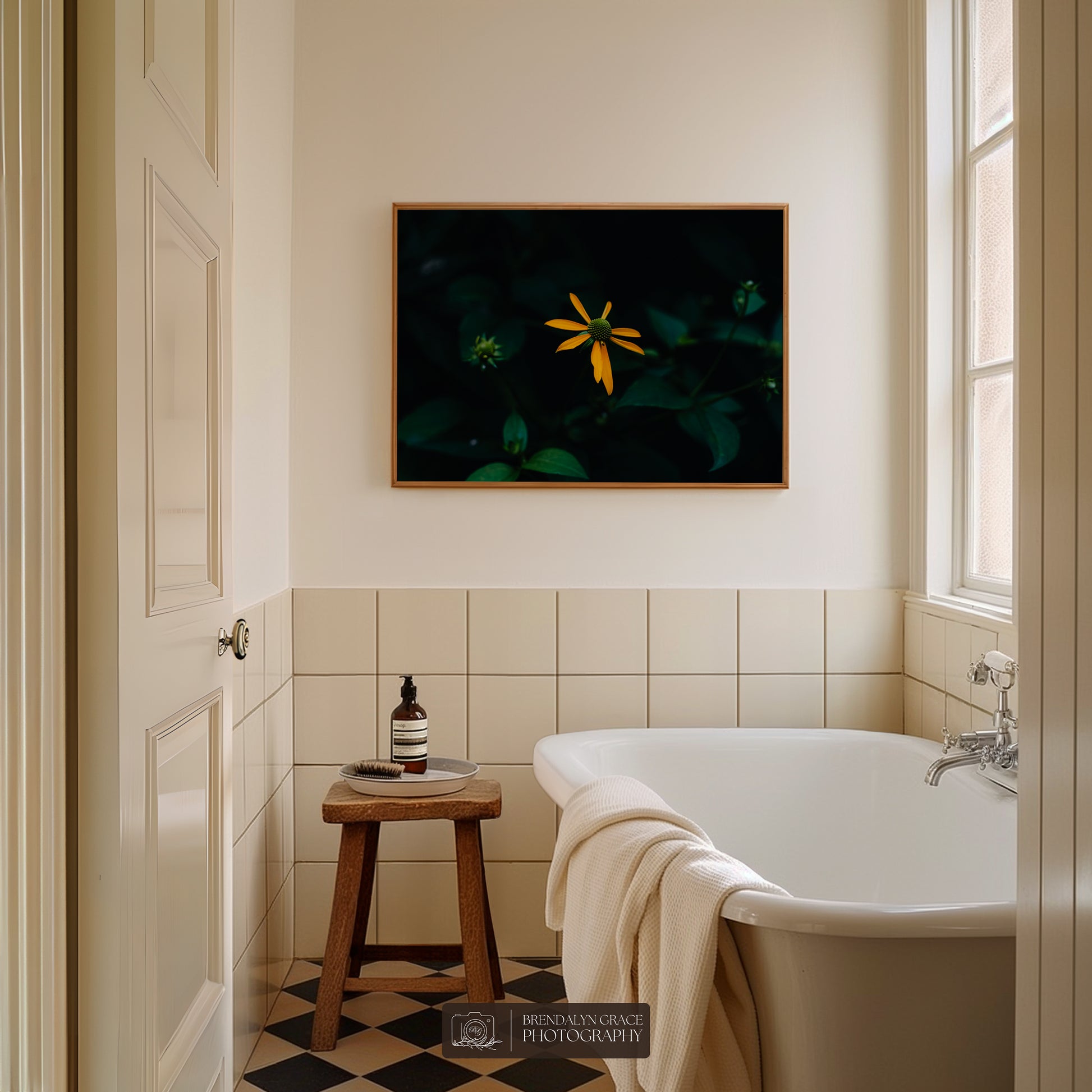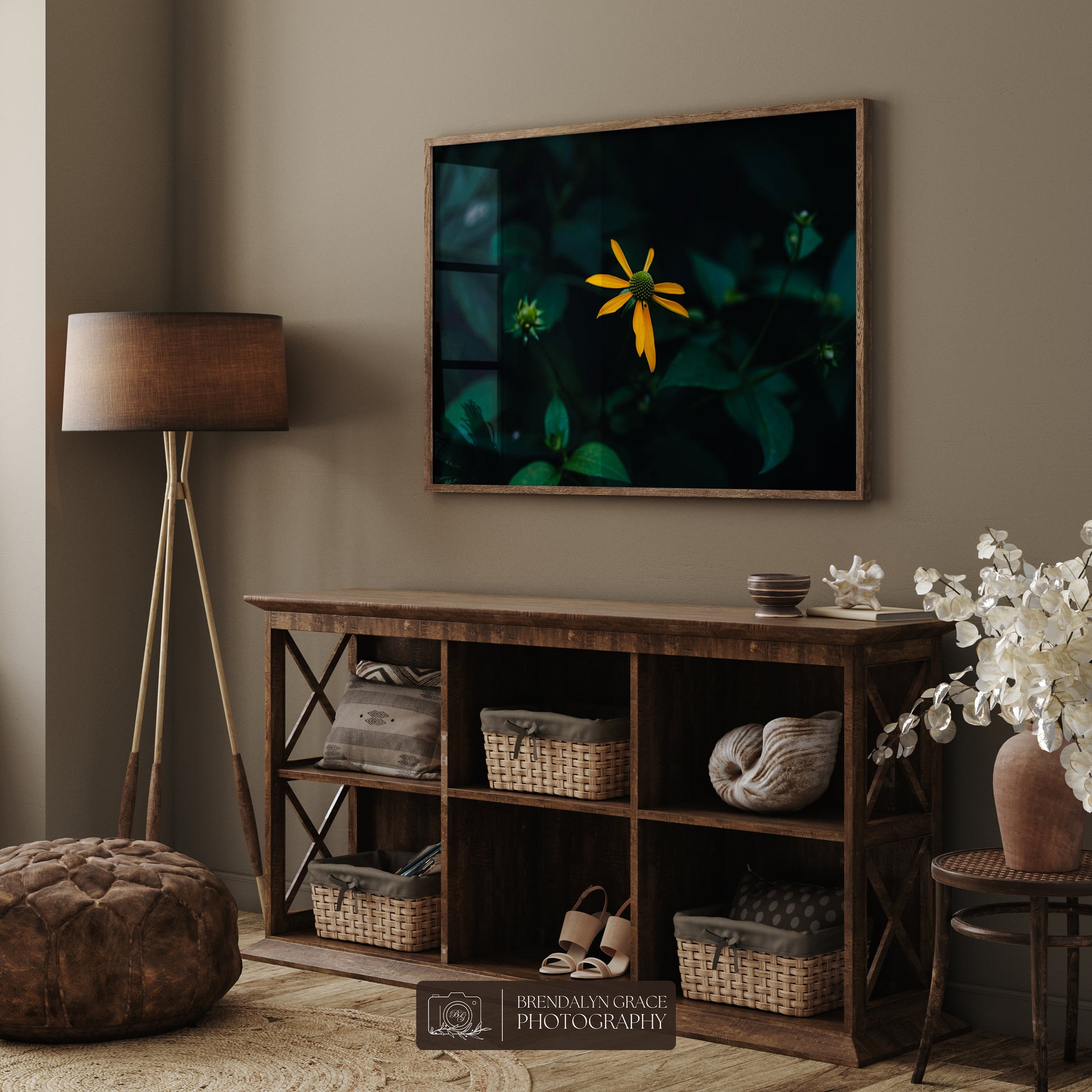 This is a print of a Black-Eyed Susan flower in Black Rock Mountain State Park, Georgia, USA. On August 7th of 2022, I took this picture of this flower as I was walking along the lake trail. I loved the beautiful pop of yellow that it brought out of the greenery.