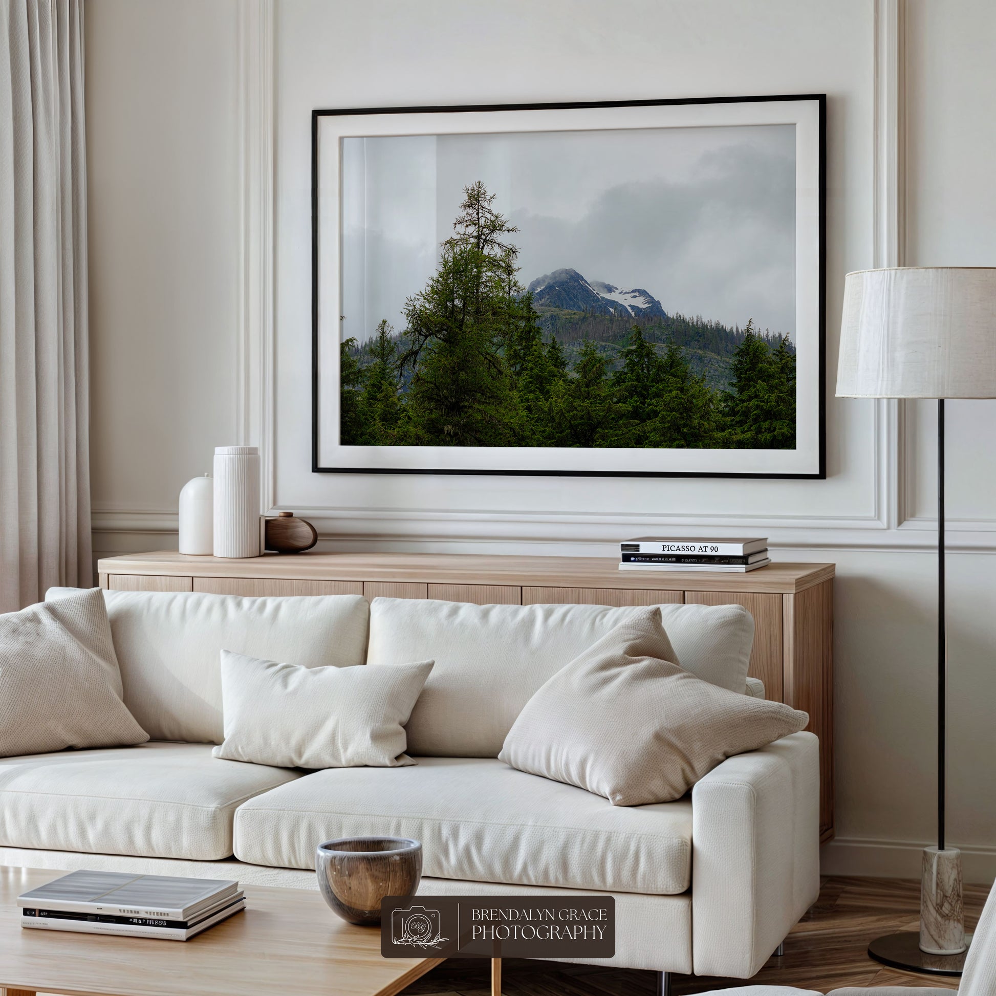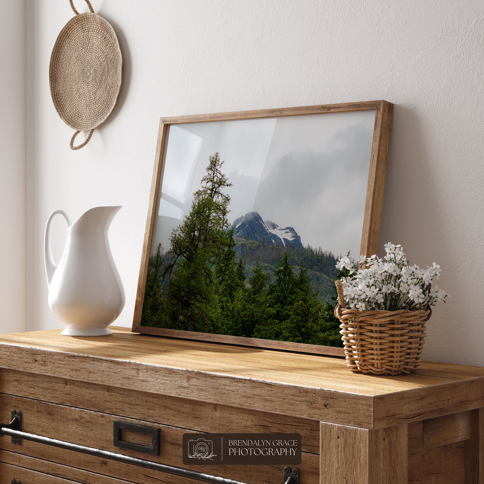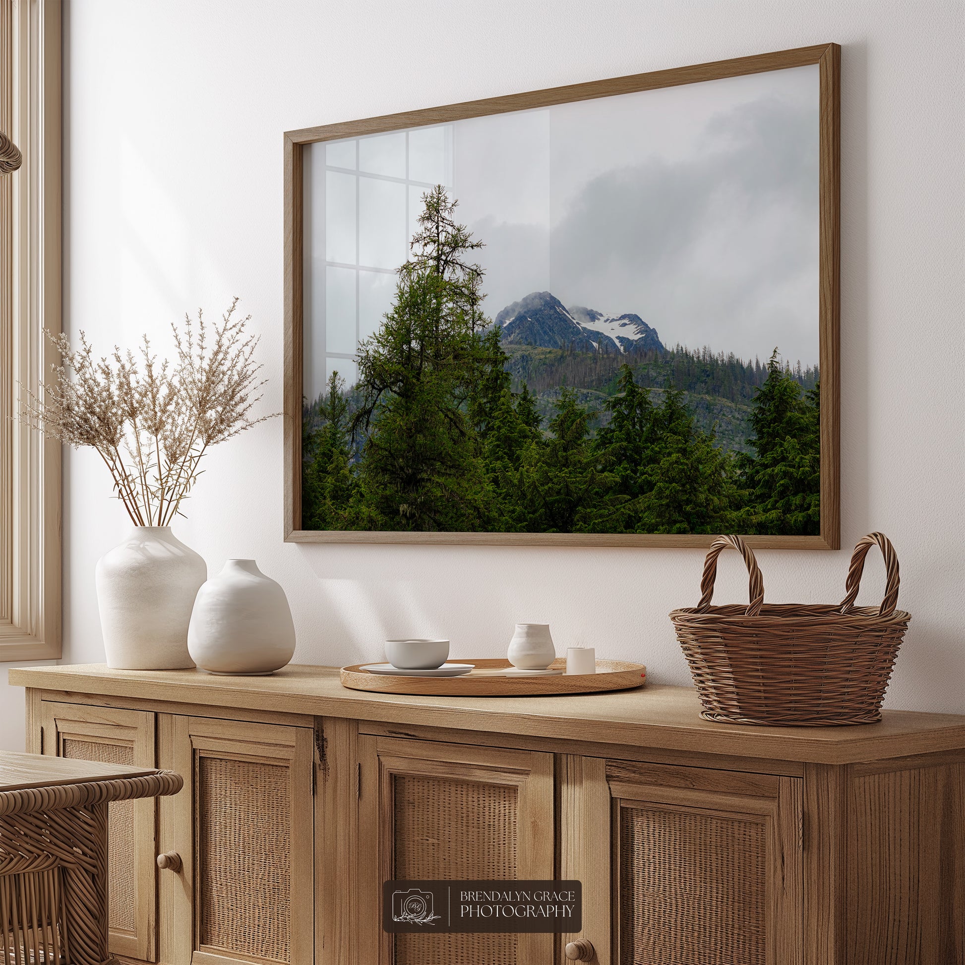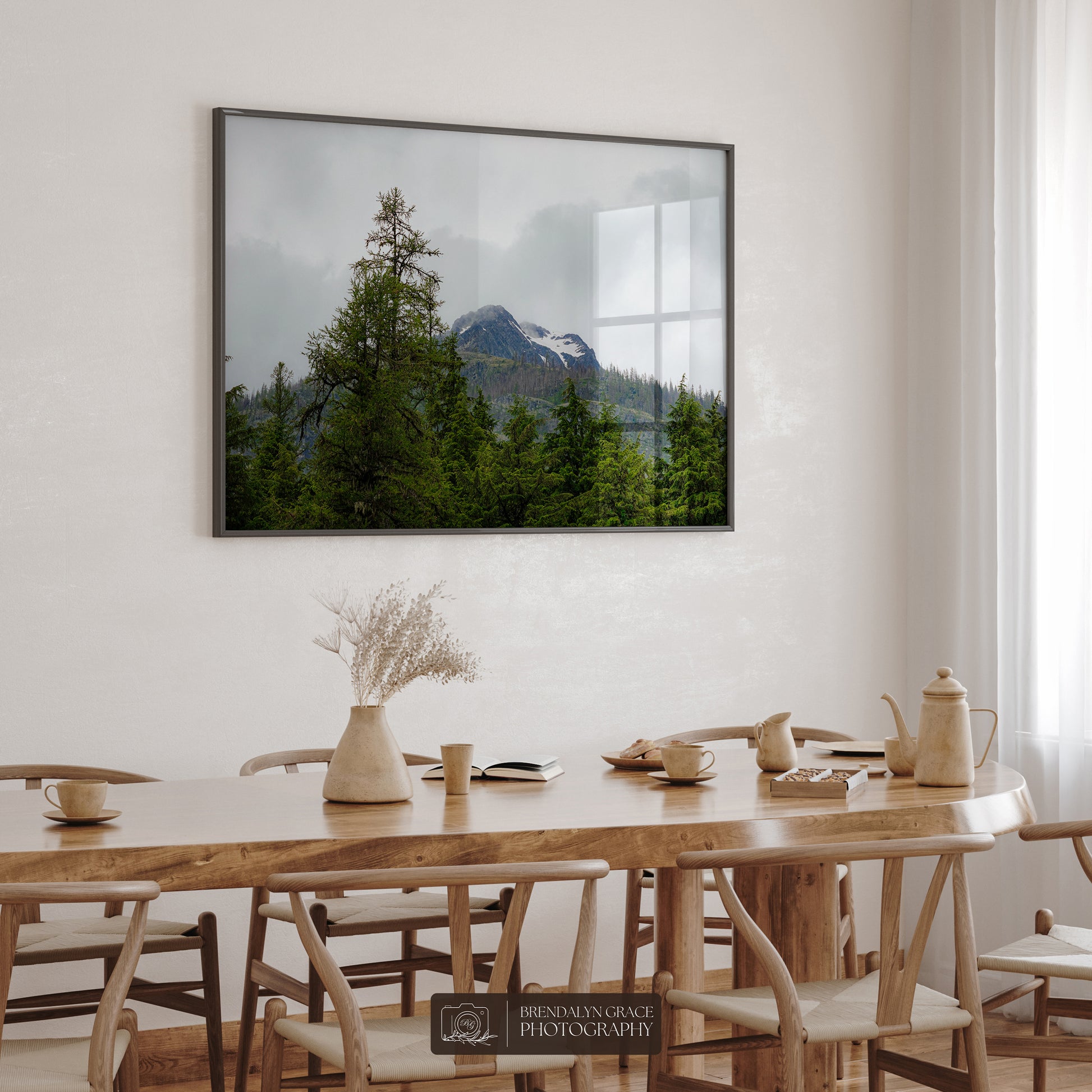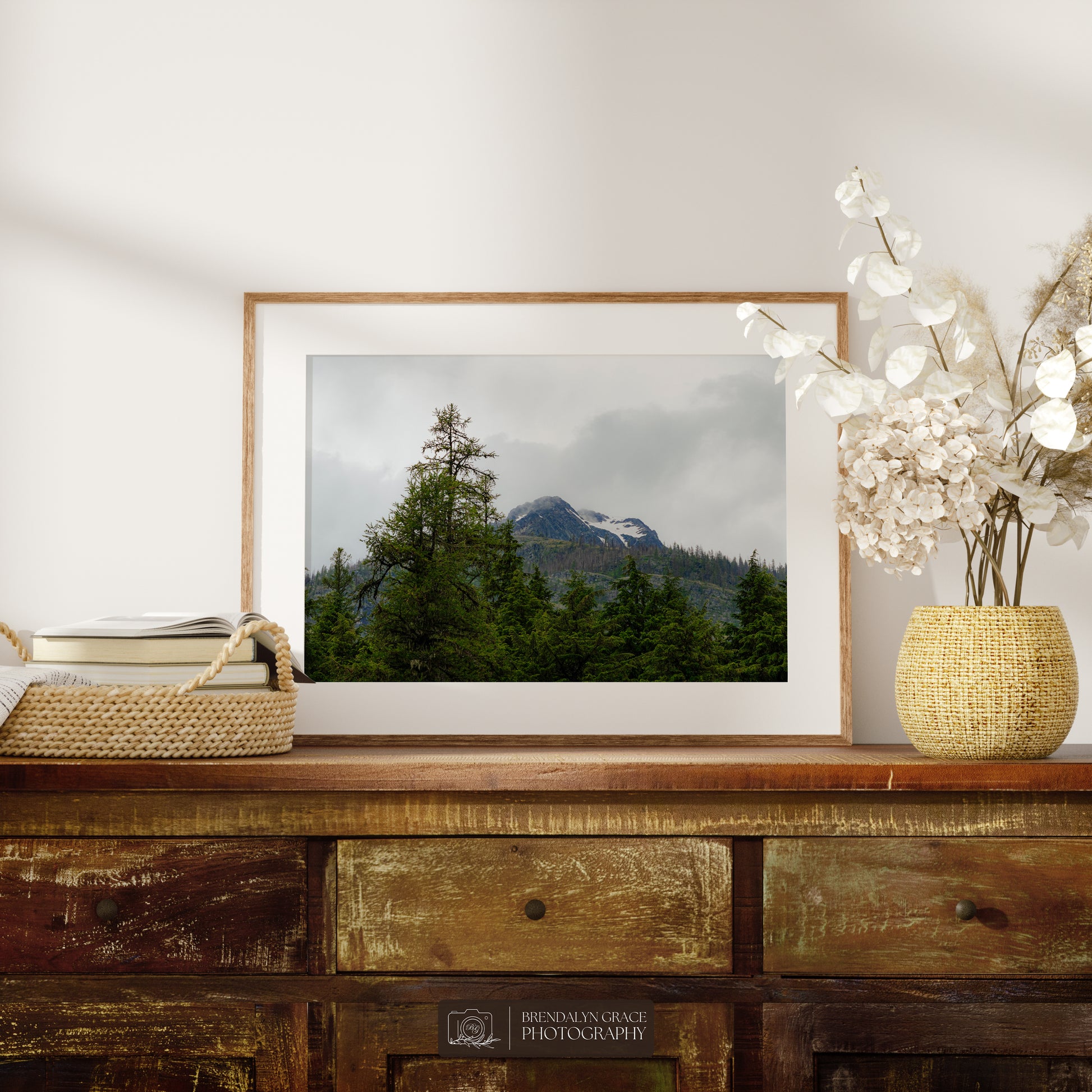 This is a print of a snow-capped mountain behind trees in Glacier National Park, Montana, USA. On July 7th of 2020, my grandparents and I visited the park during our western USA roadtrip. It was rainy and very foggy, but luckily the fog moved long enough for me to take this picture.