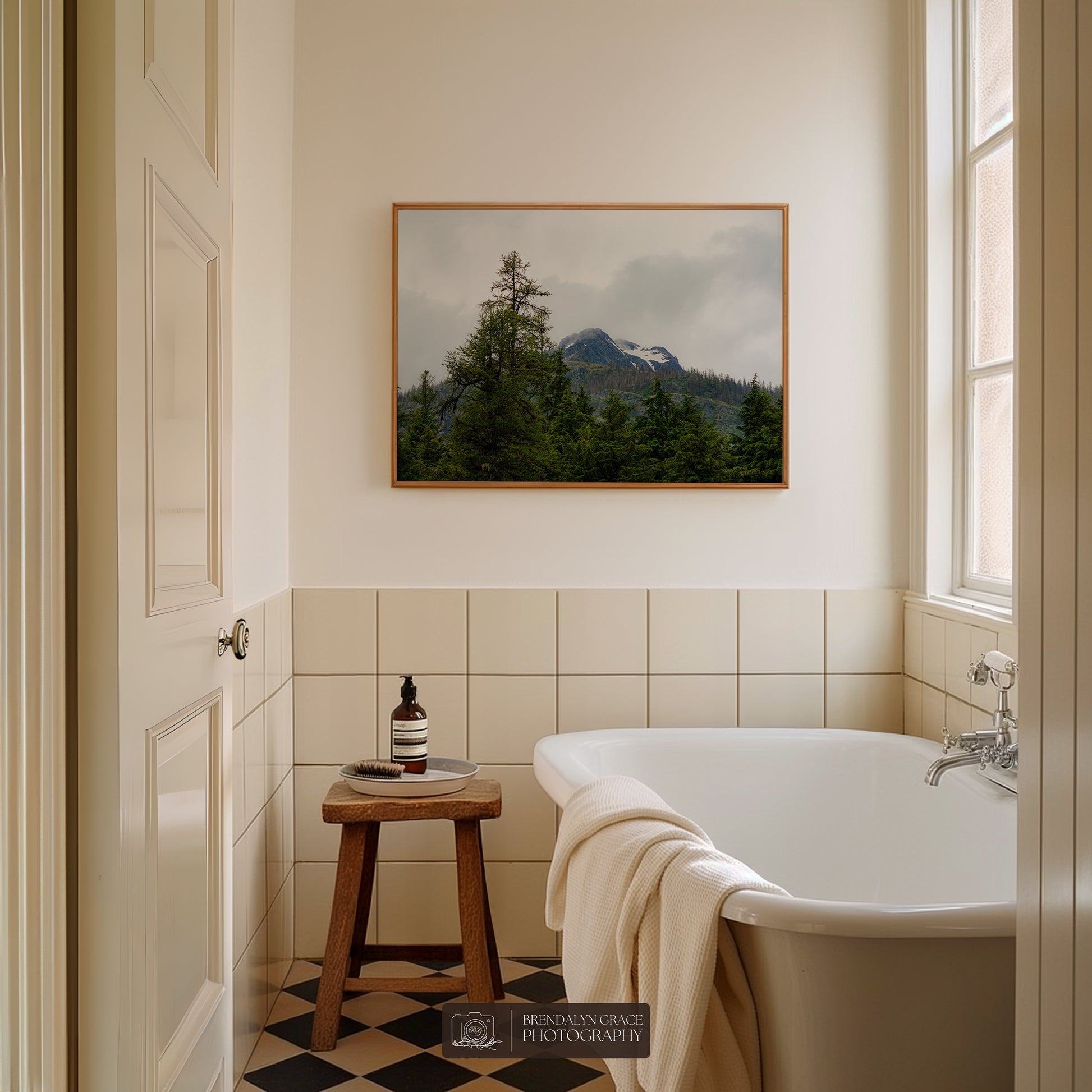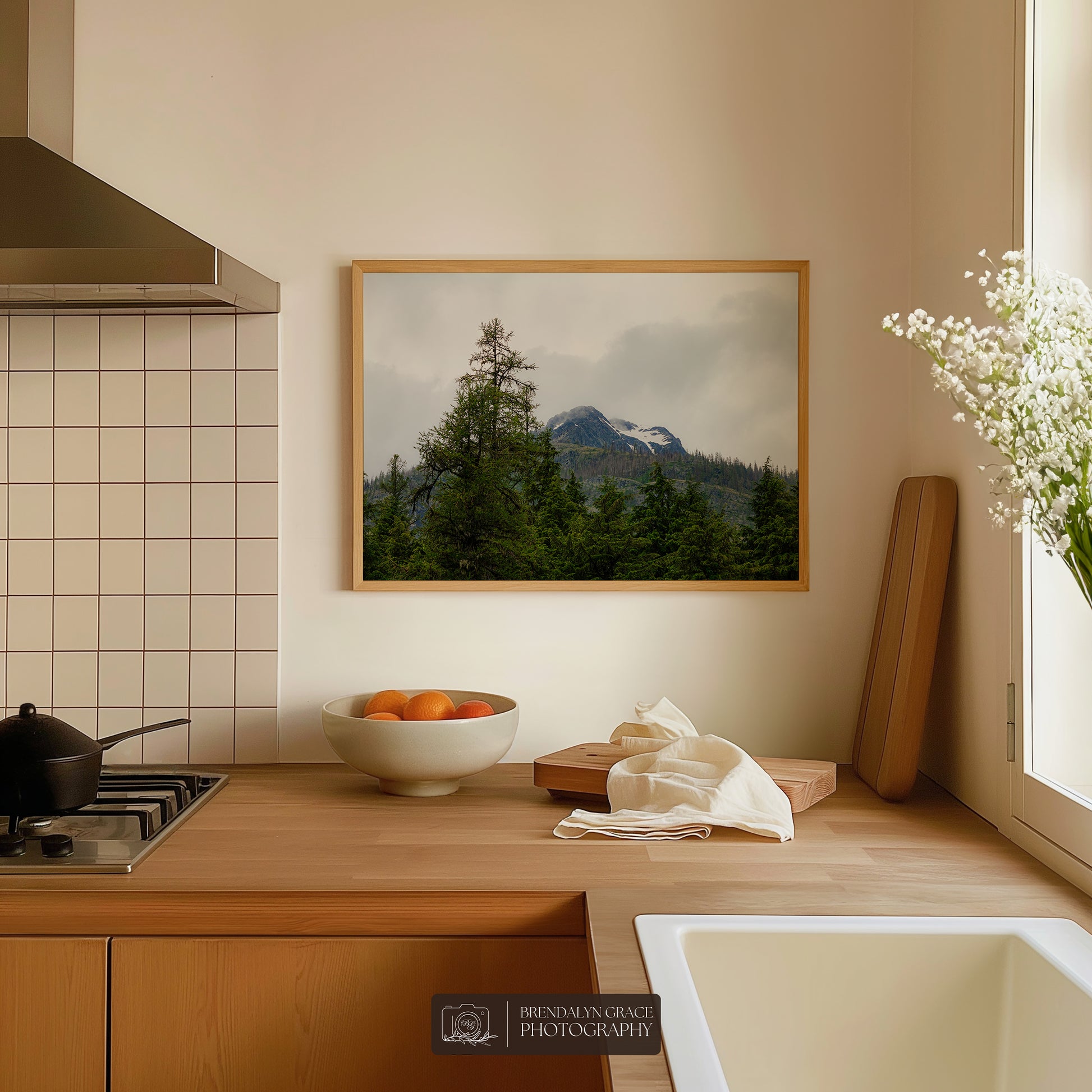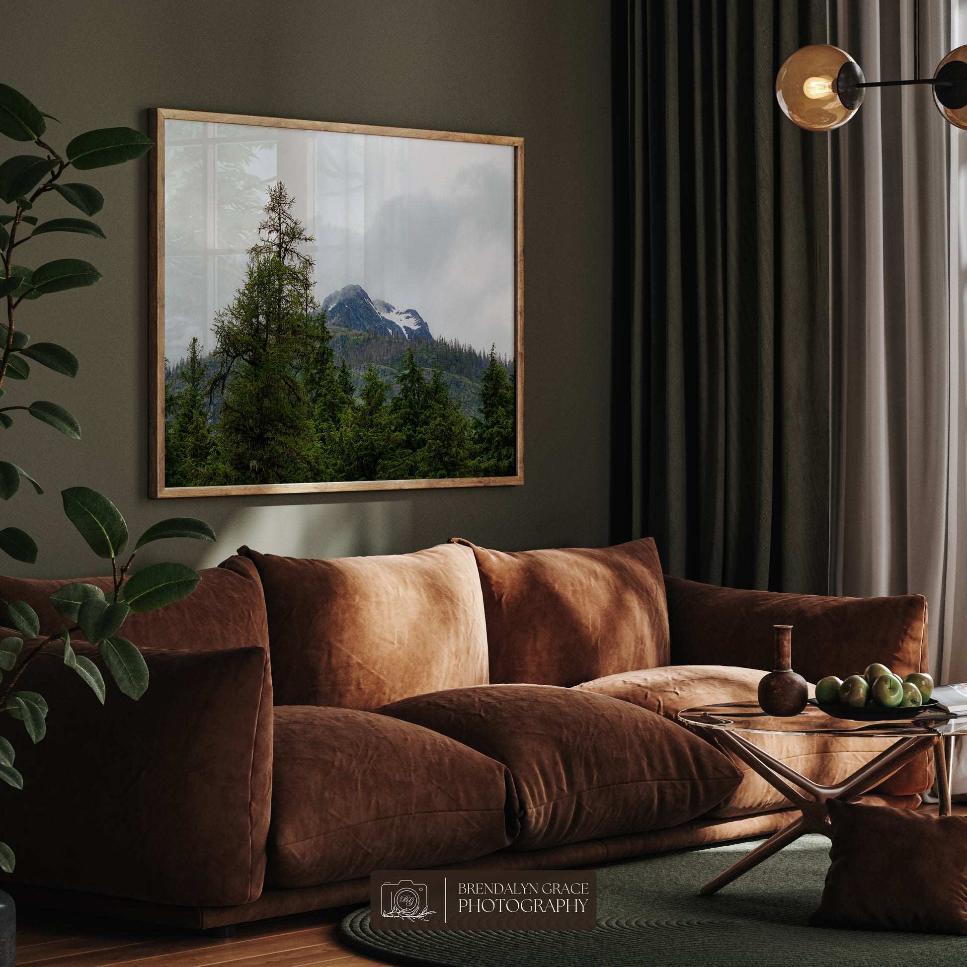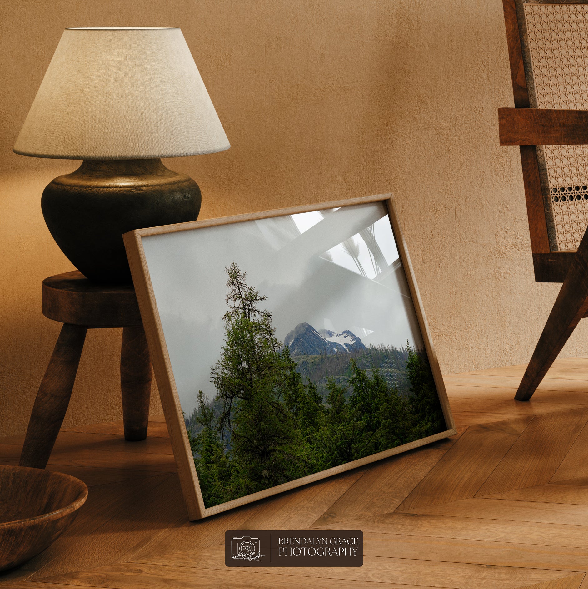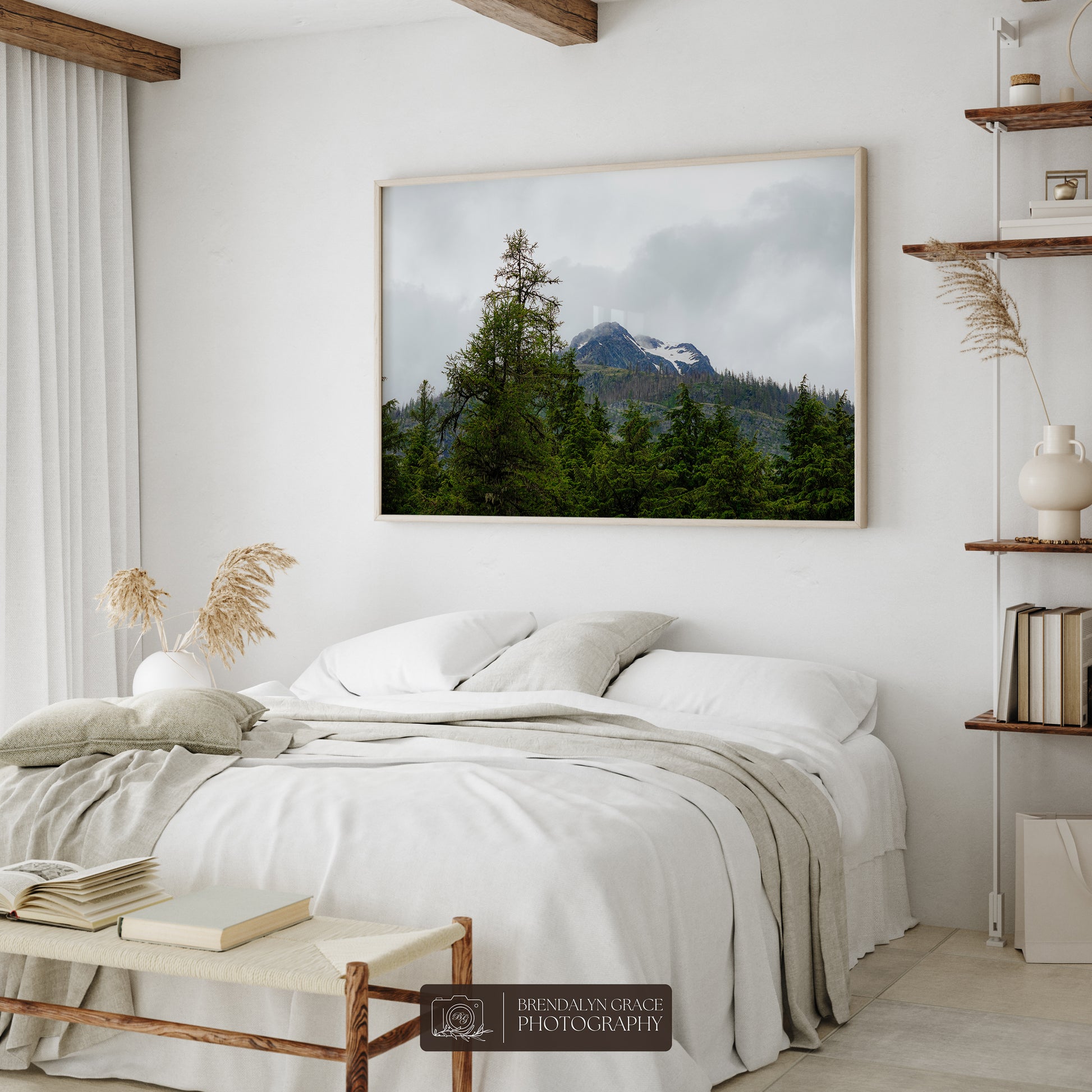 This is a print of a snow-capped mountain behind trees in Glacier National Park, Montana, USA. On July 7th of 2020, my grandparents and I visited the park during our western USA roadtrip. It was rainy and very foggy, but luckily the fog moved long enough for me to take this picture.