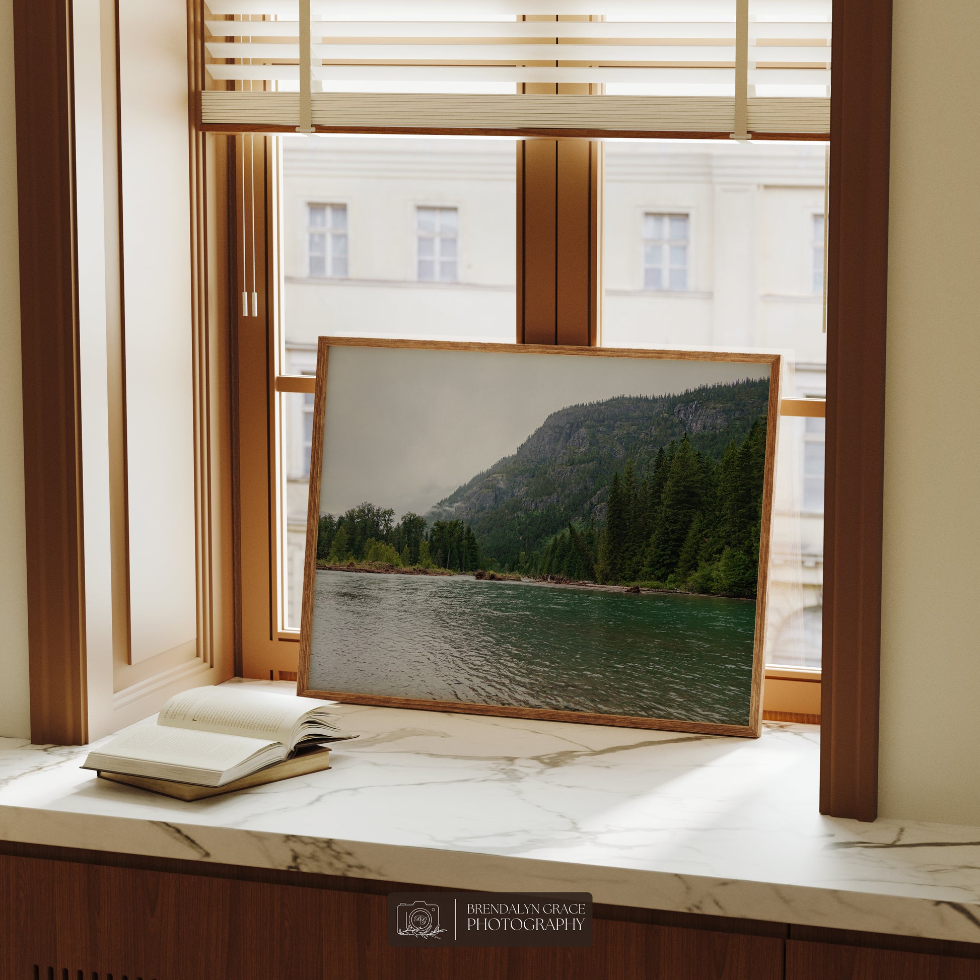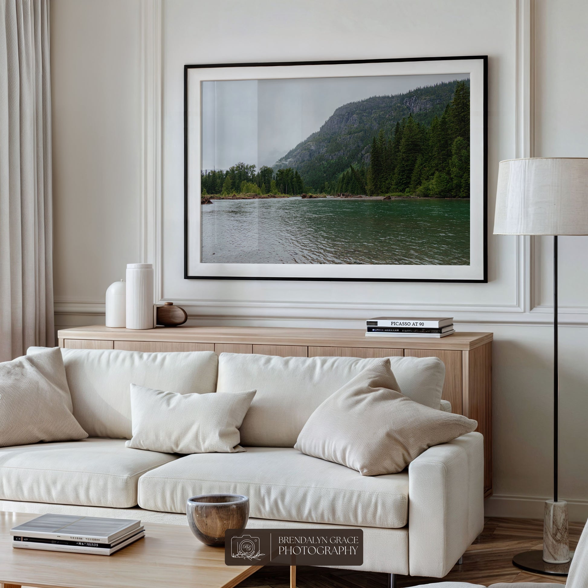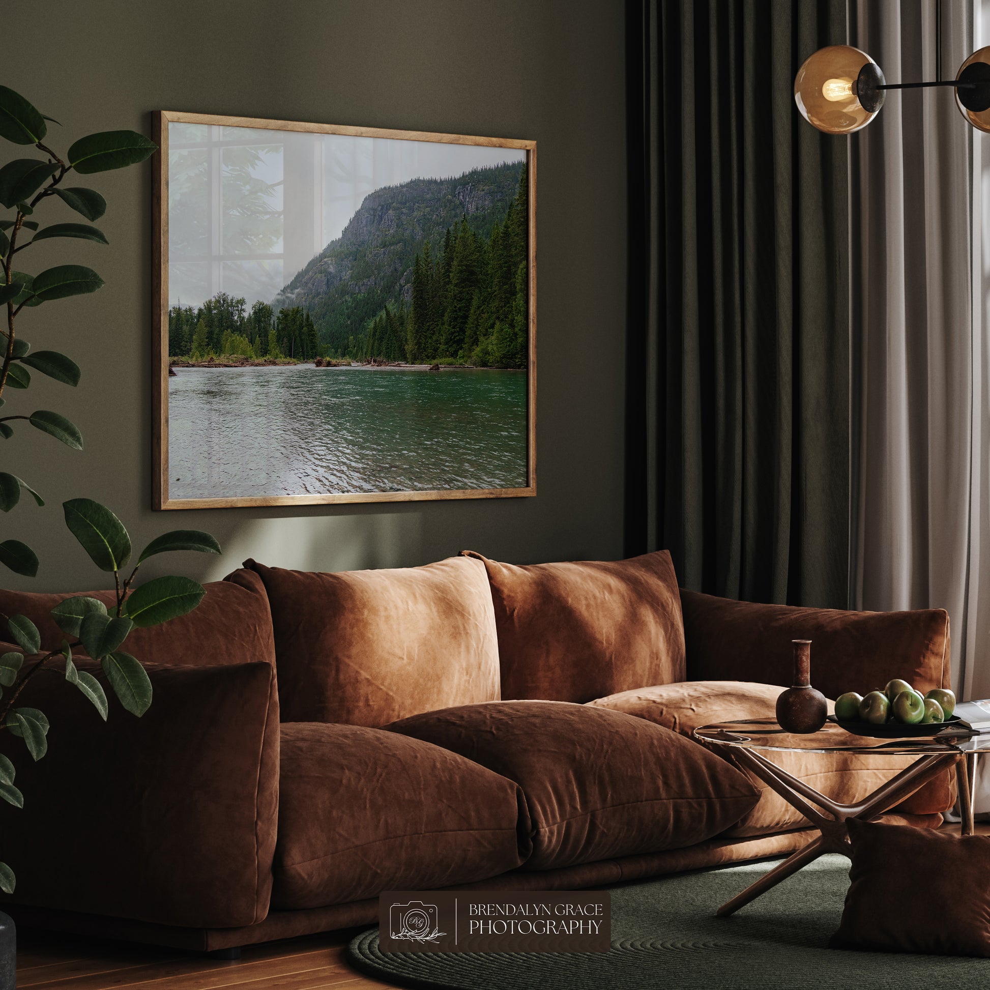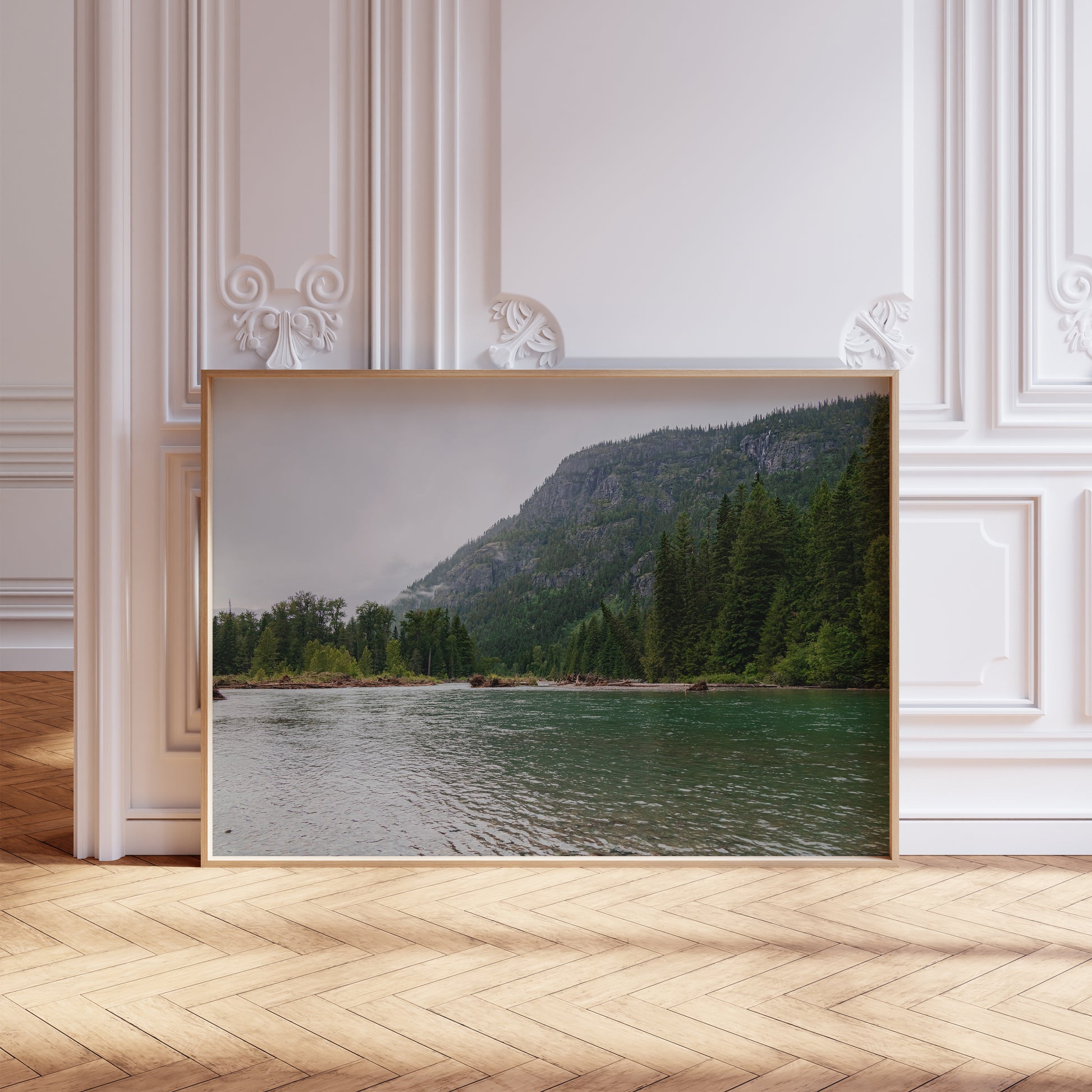 This is a print of a river lined with trees and a large mountain in Glacier National Park, Montana, USA. On July 7th of 2020, my grandparents and I visited the park during our western USA roadtrip.