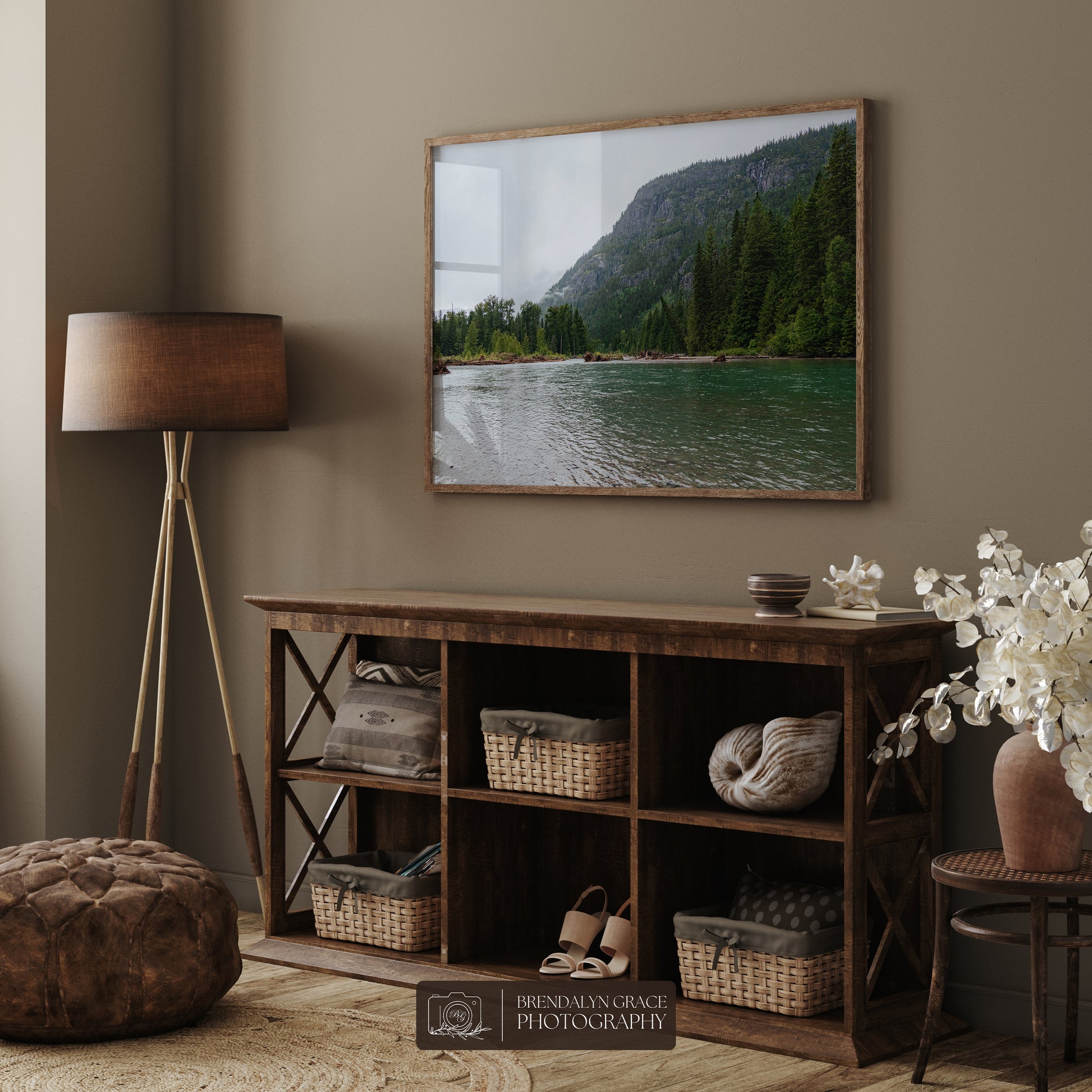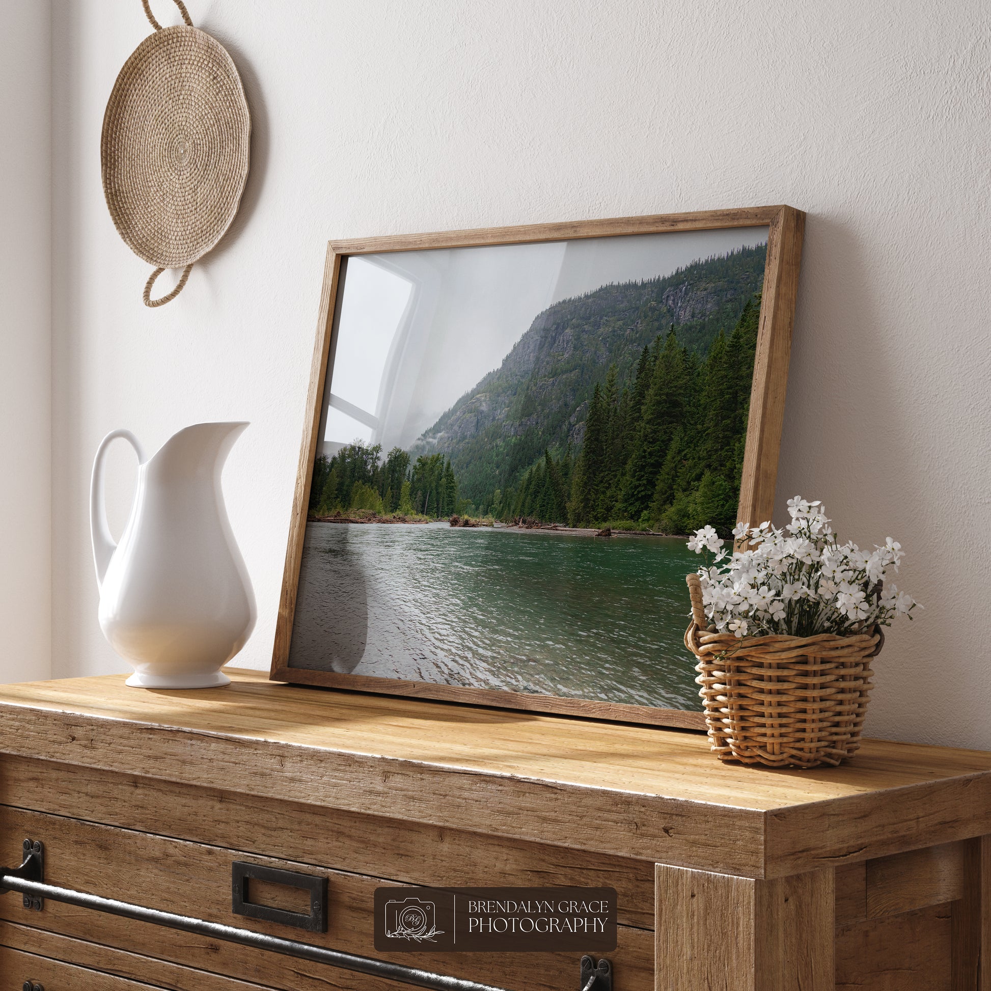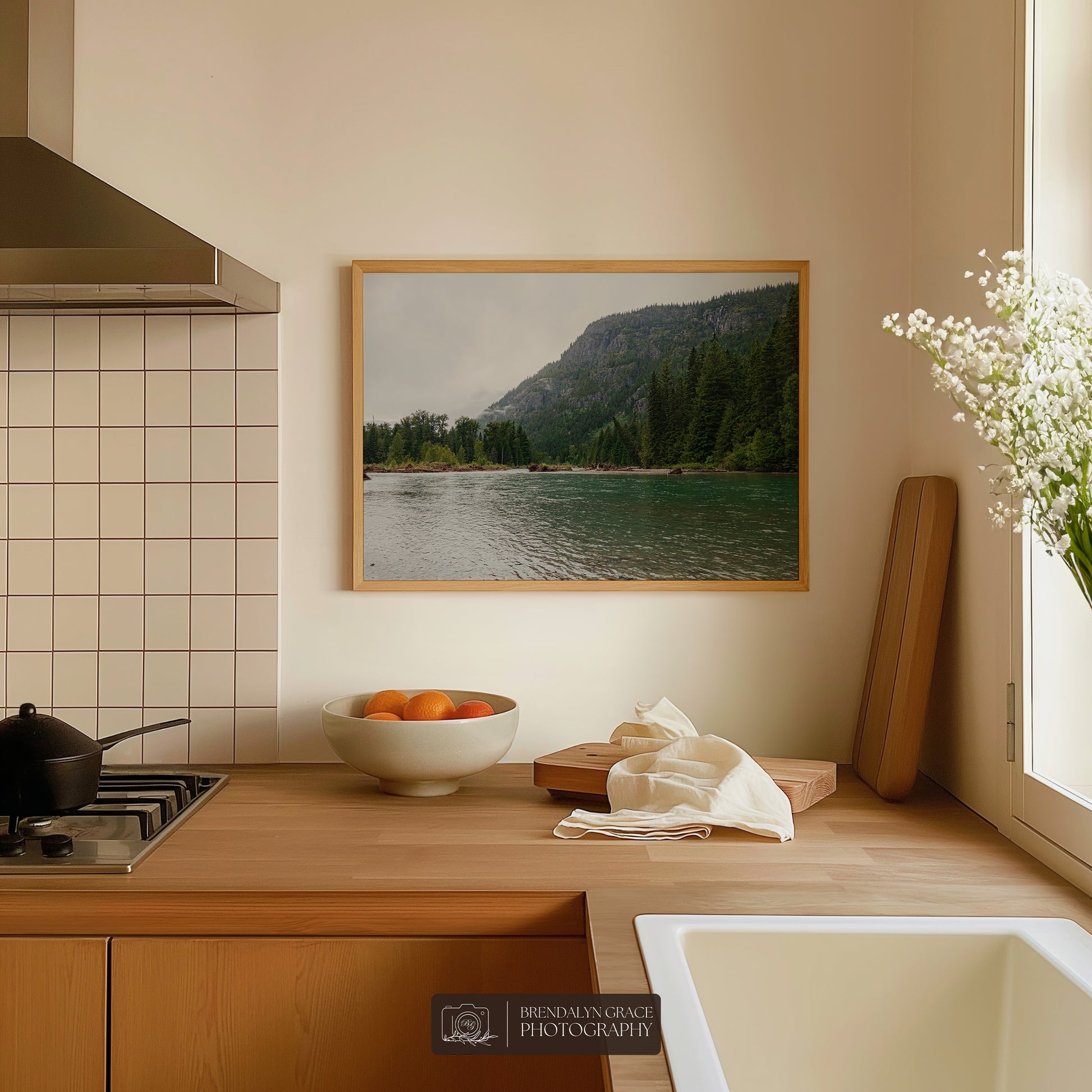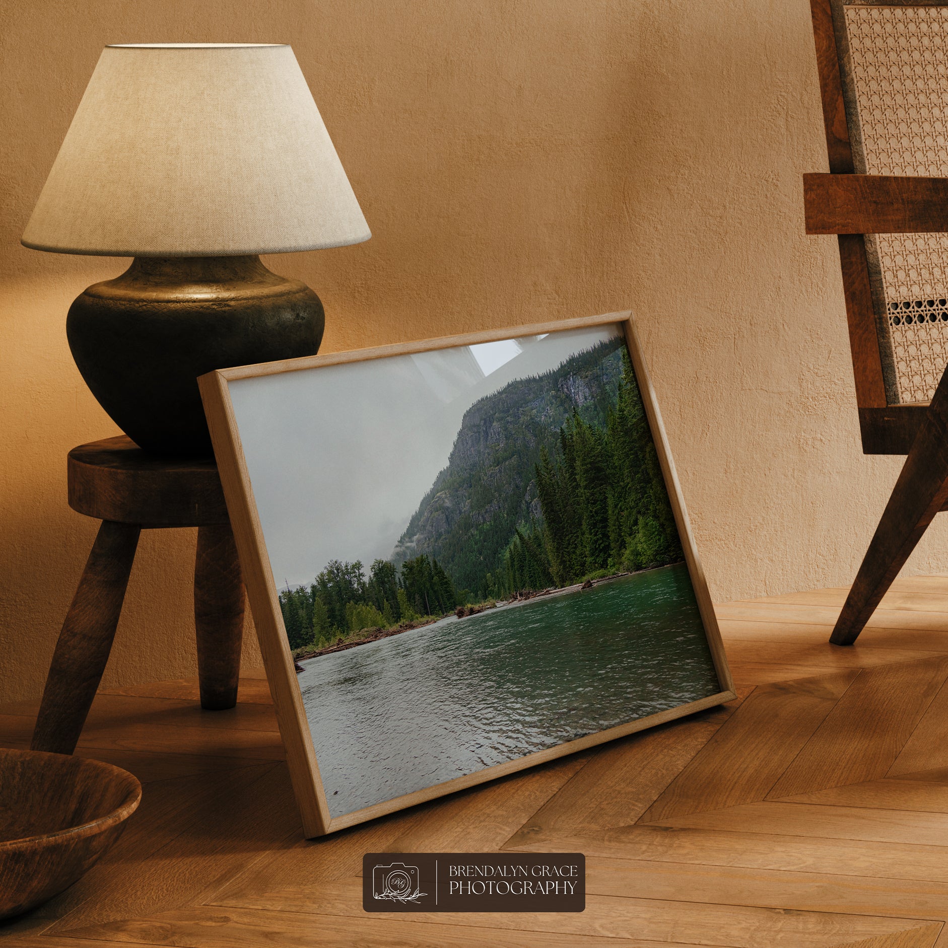 This is a print of a river lined with trees and a large mountain in Glacier National Park, Montana, USA. On July 7th of 2020, my grandparents and I visited the park during our western USA roadtrip.