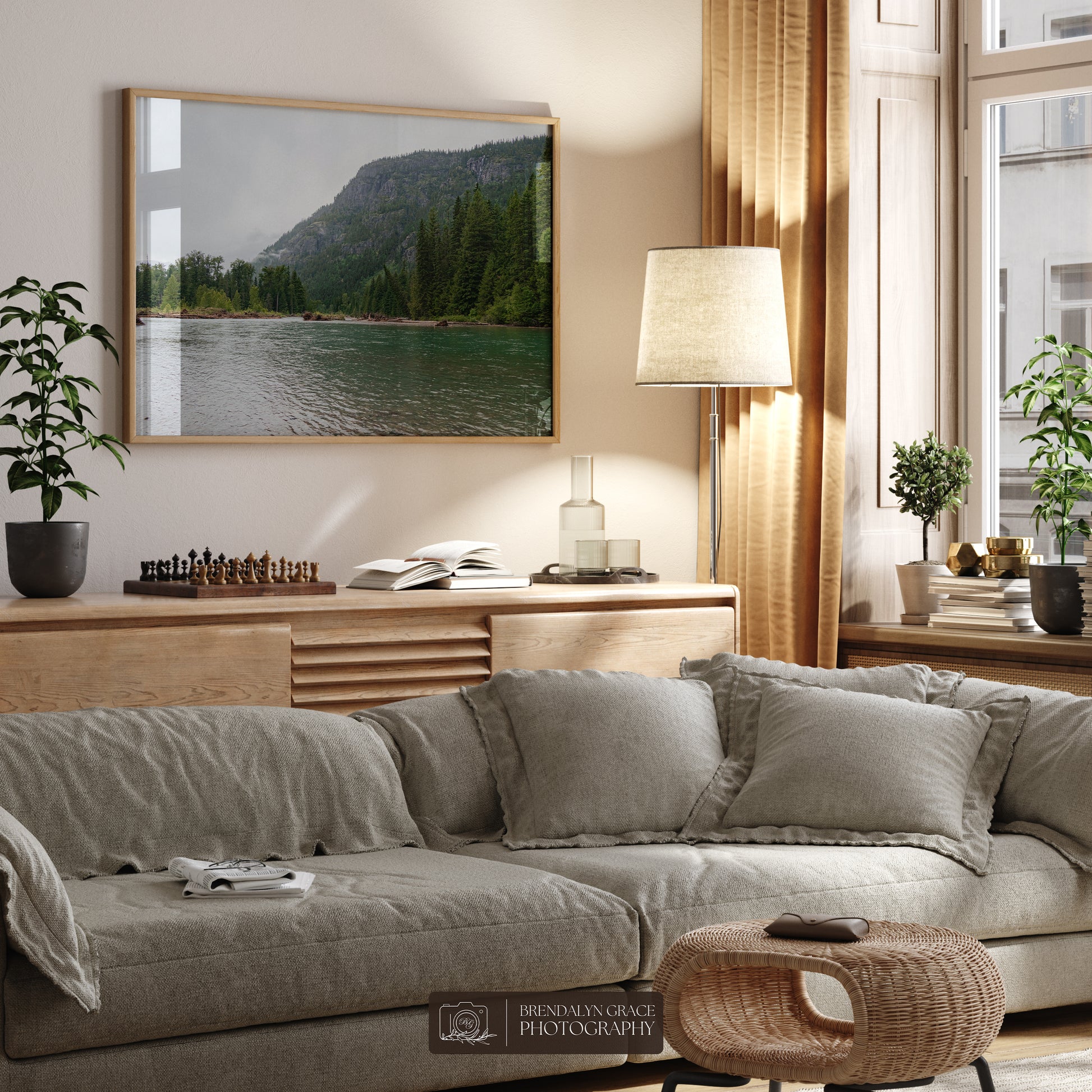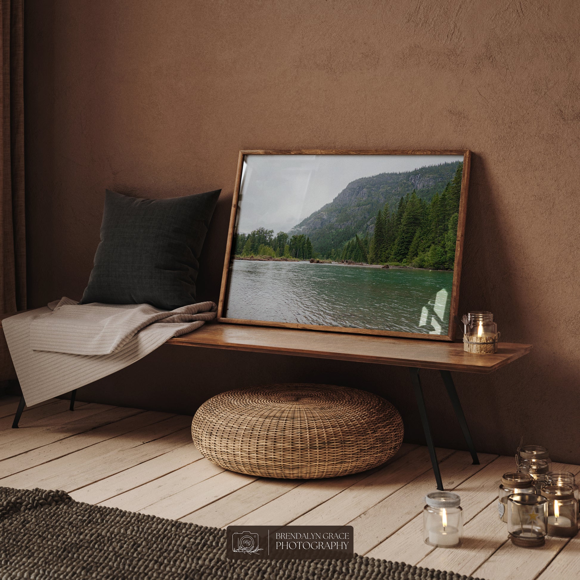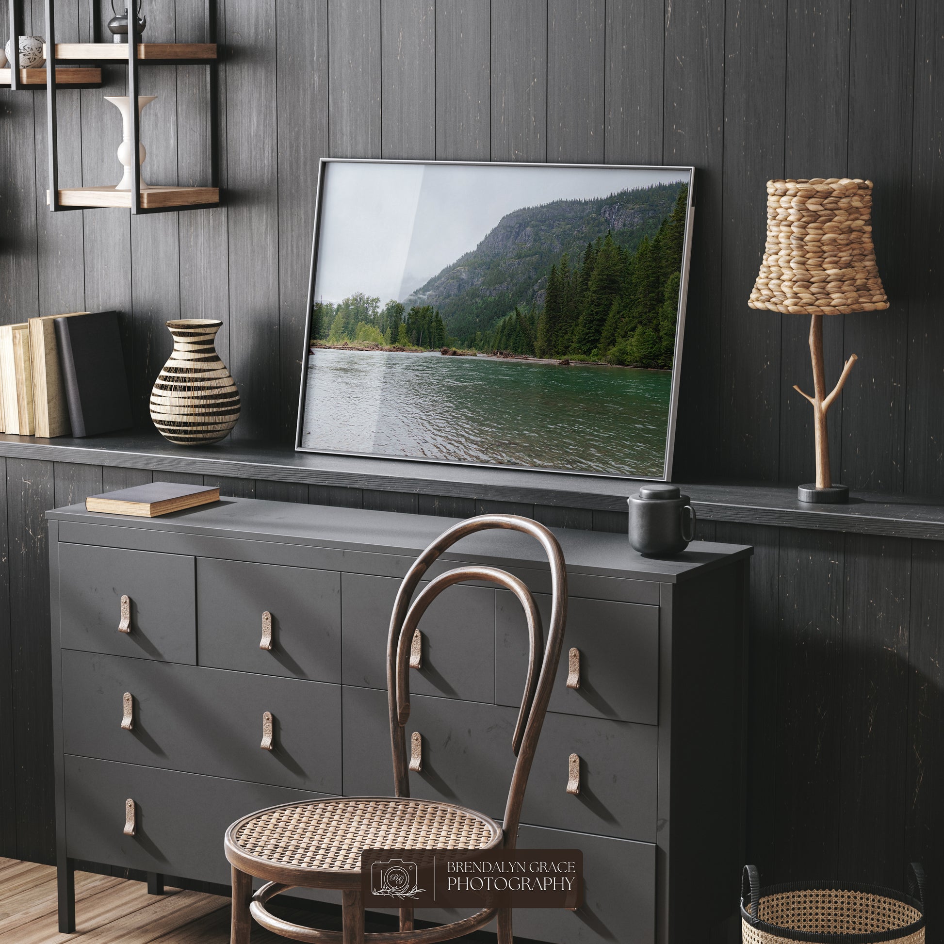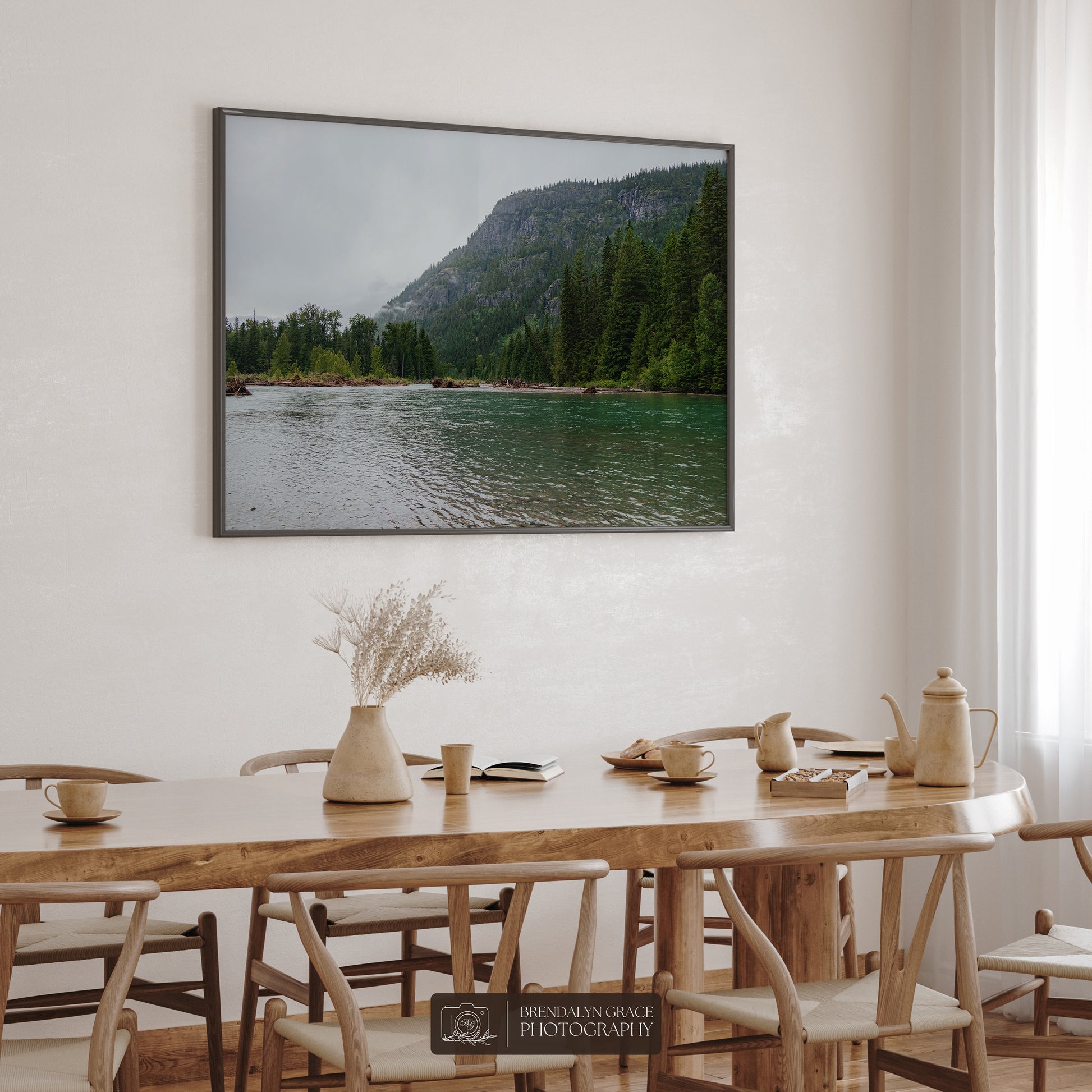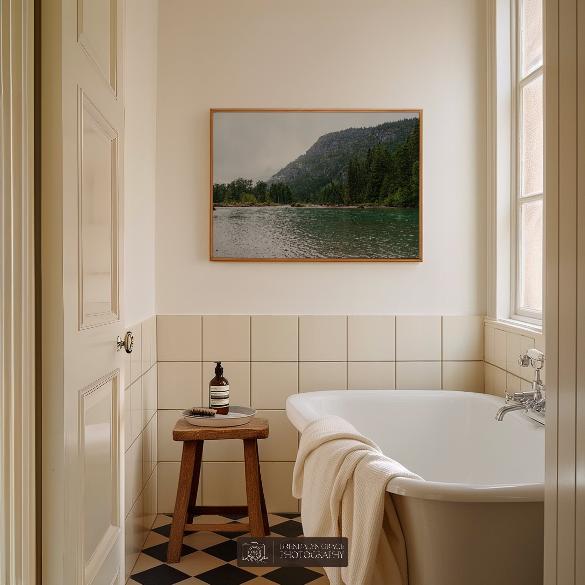 This is a print of a river lined with trees and a large mountain in Glacier National Park, Montana, USA. On July 7th of 2020, my grandparents and I visited the park during our western USA roadtrip.
