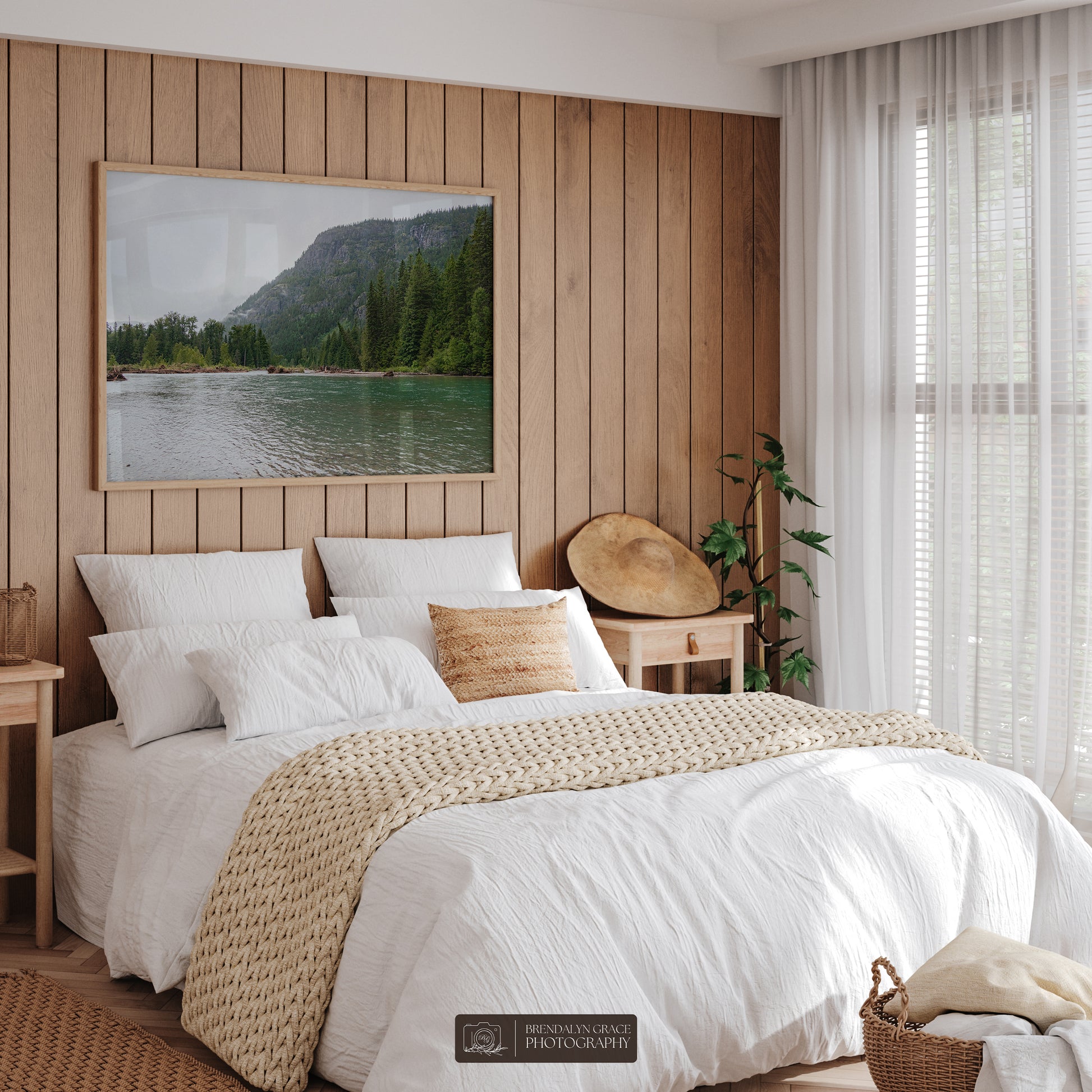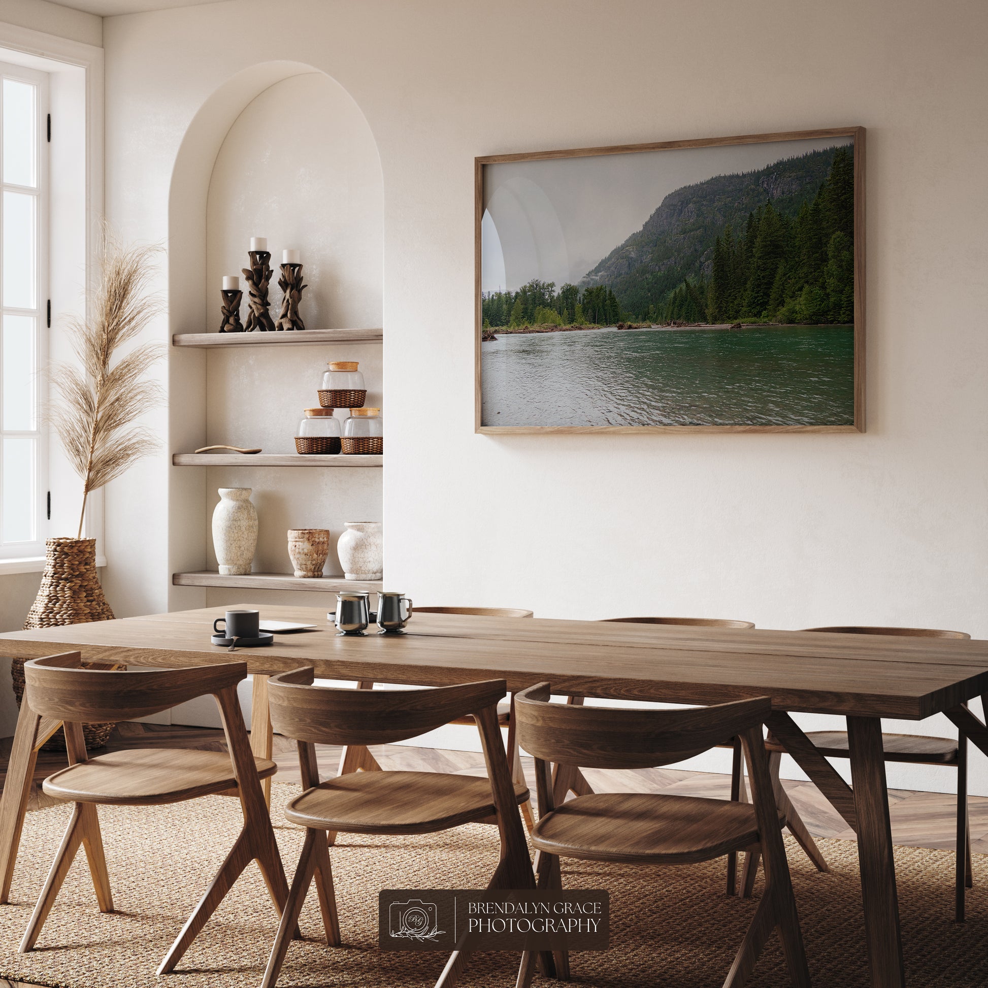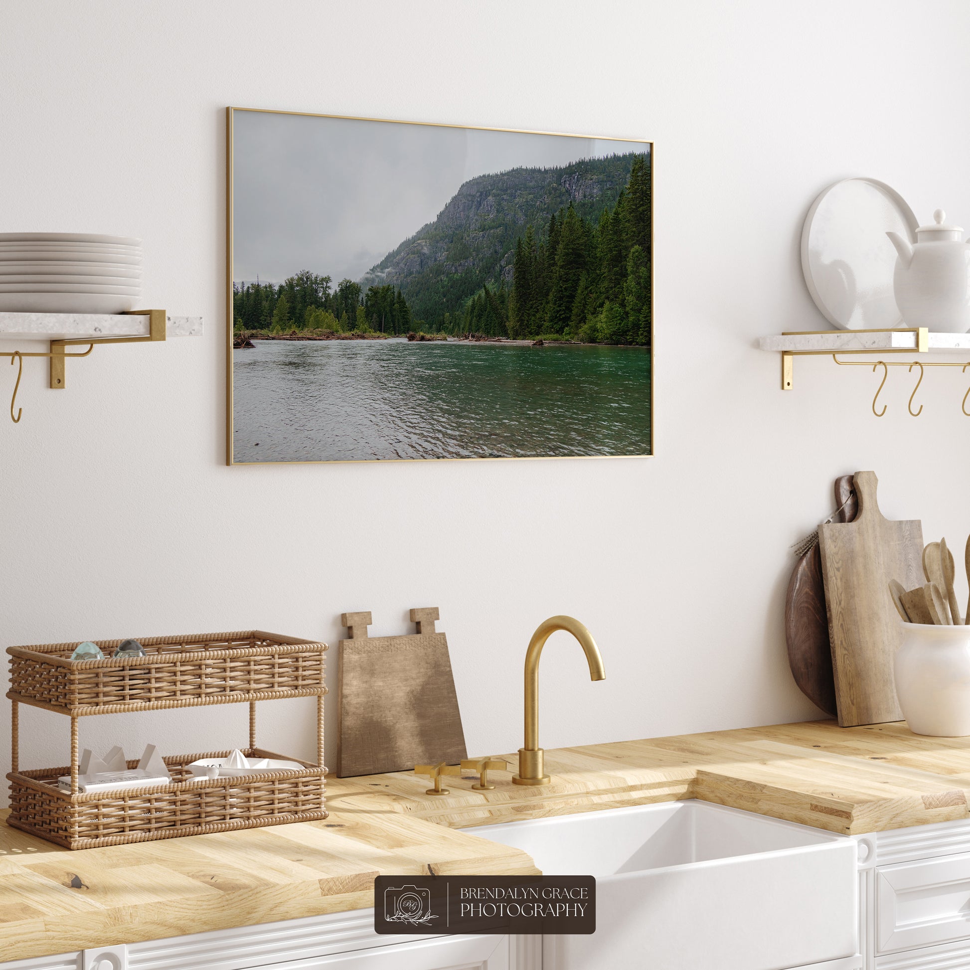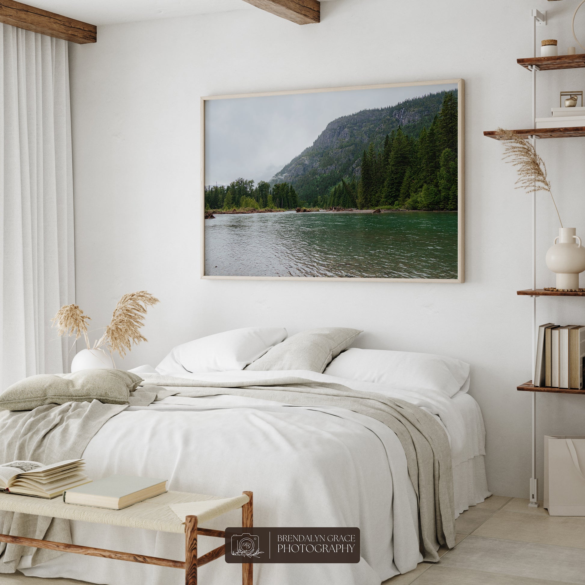 This is a print of a river lined with trees and a large mountain in Glacier National Park, Montana, USA. On July 7th of 2020, my grandparents and I visited the park during our western USA roadtrip.