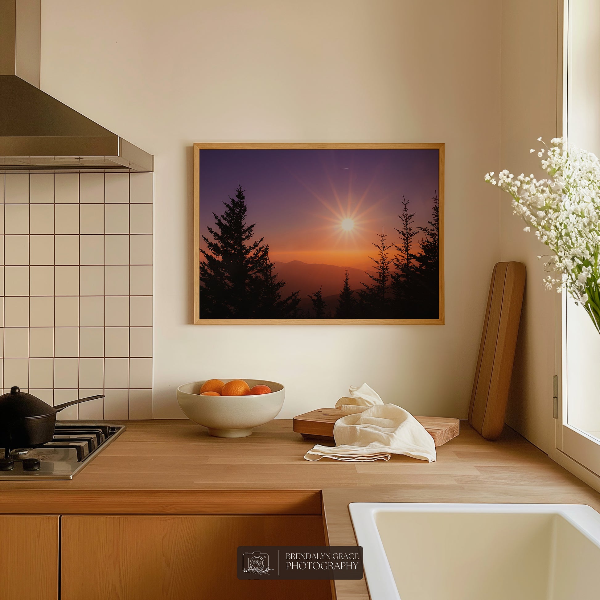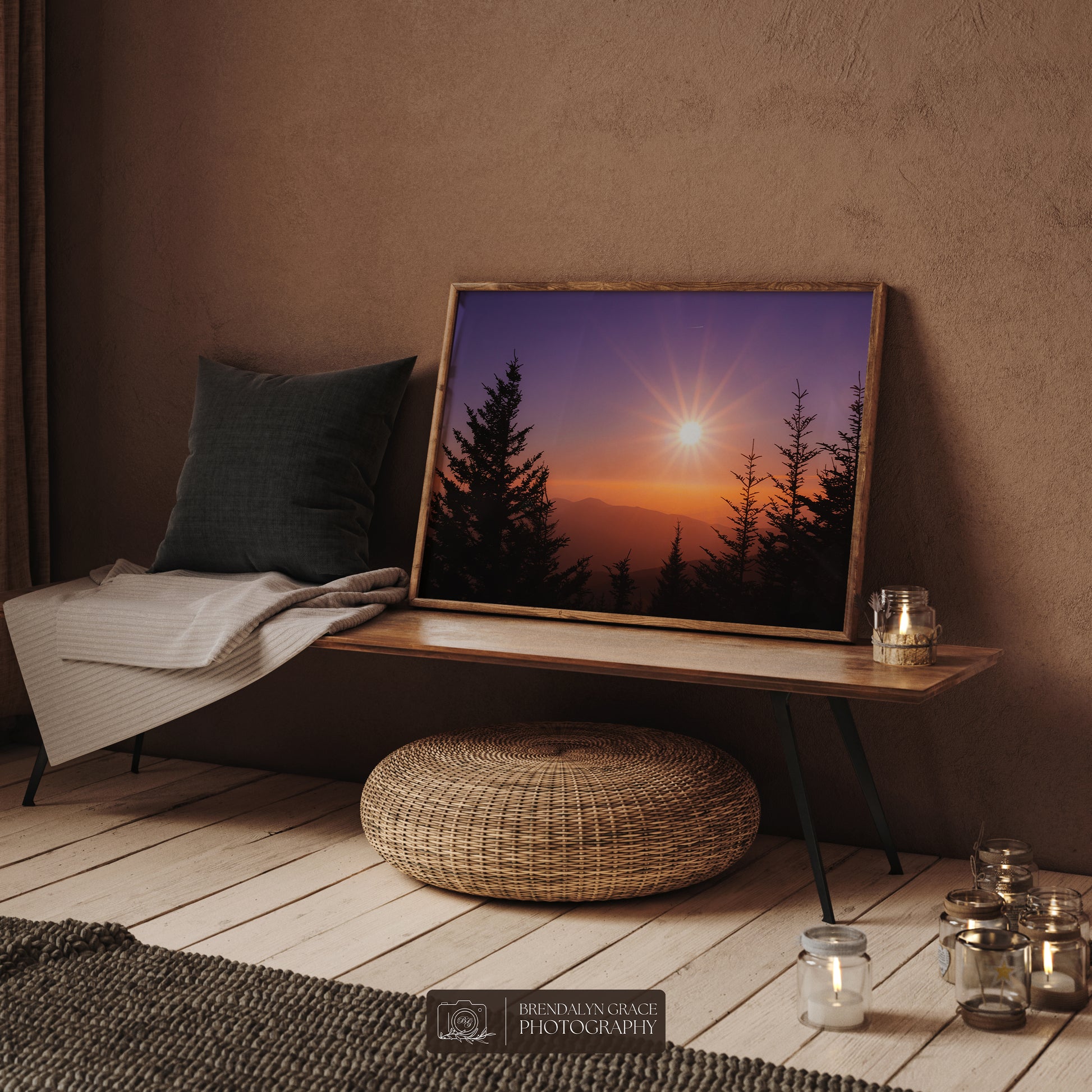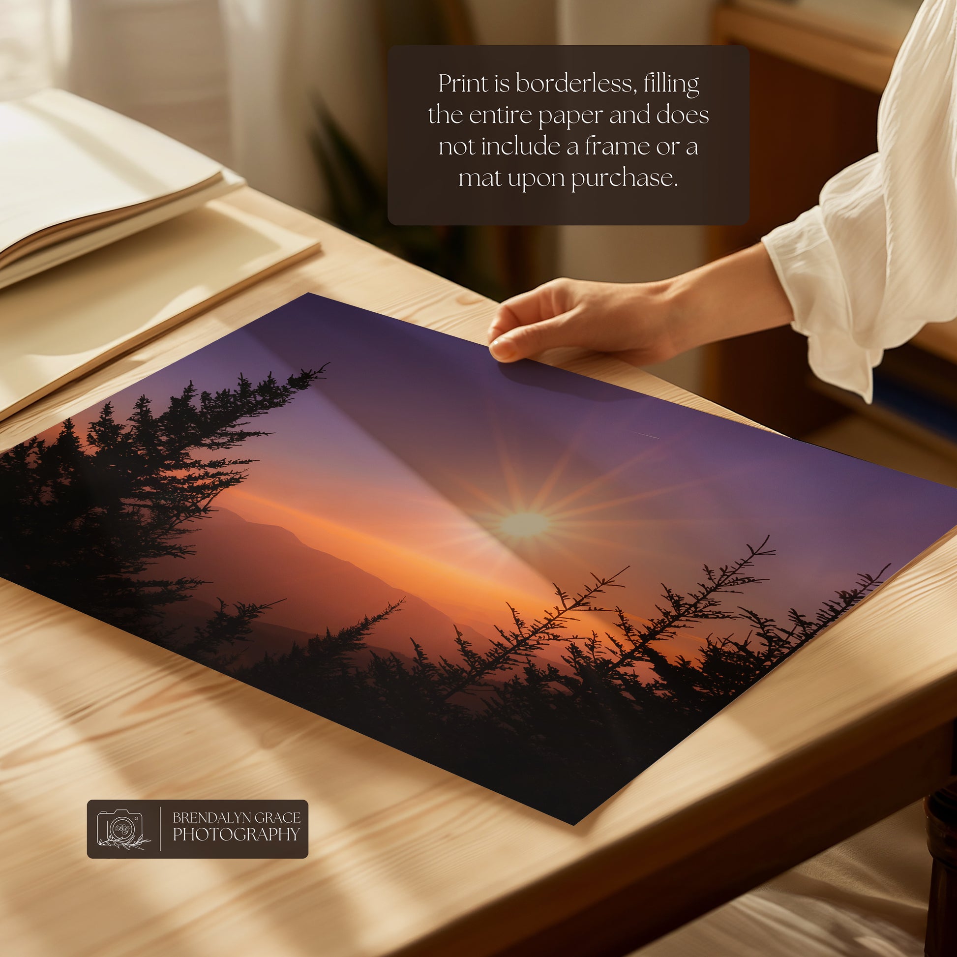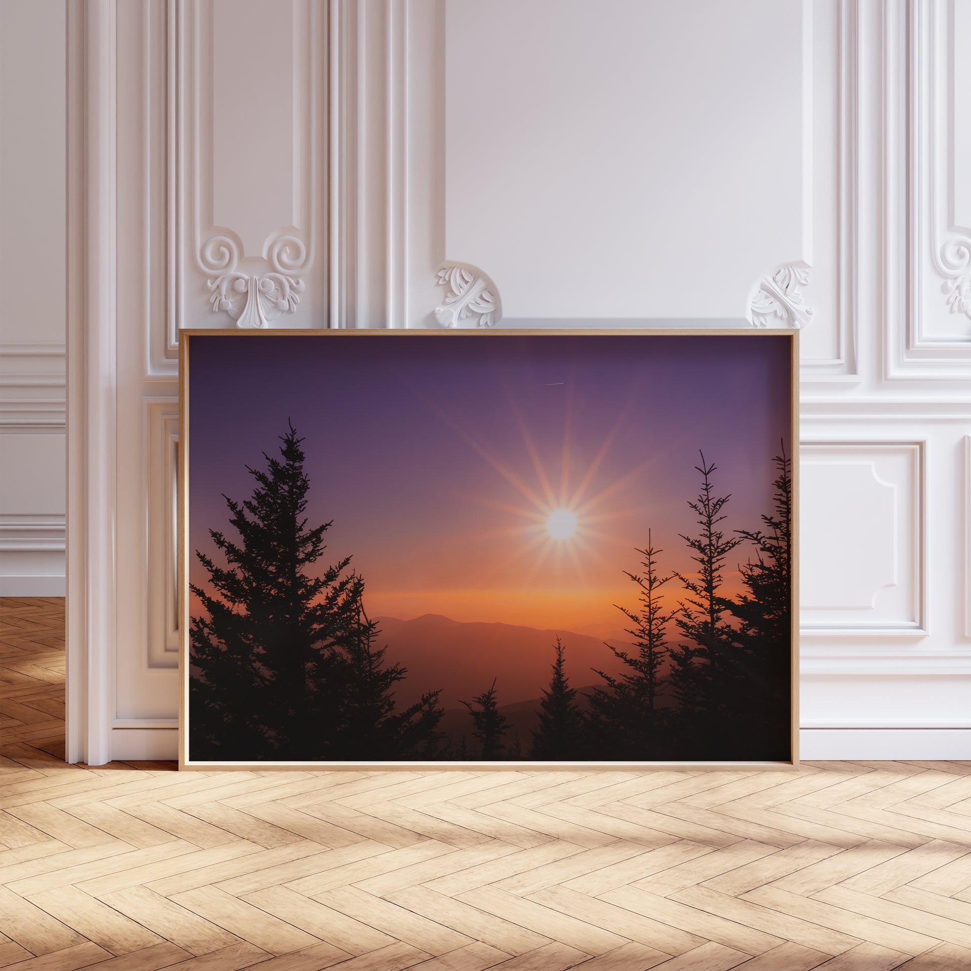 This is a print of a stunning sunset through the trees and over the mountains of the Great Smoky Mountains National Park, USA. This picture was taken on October 29th of 2023, in the parking lot at Clingman's Dome in the park.