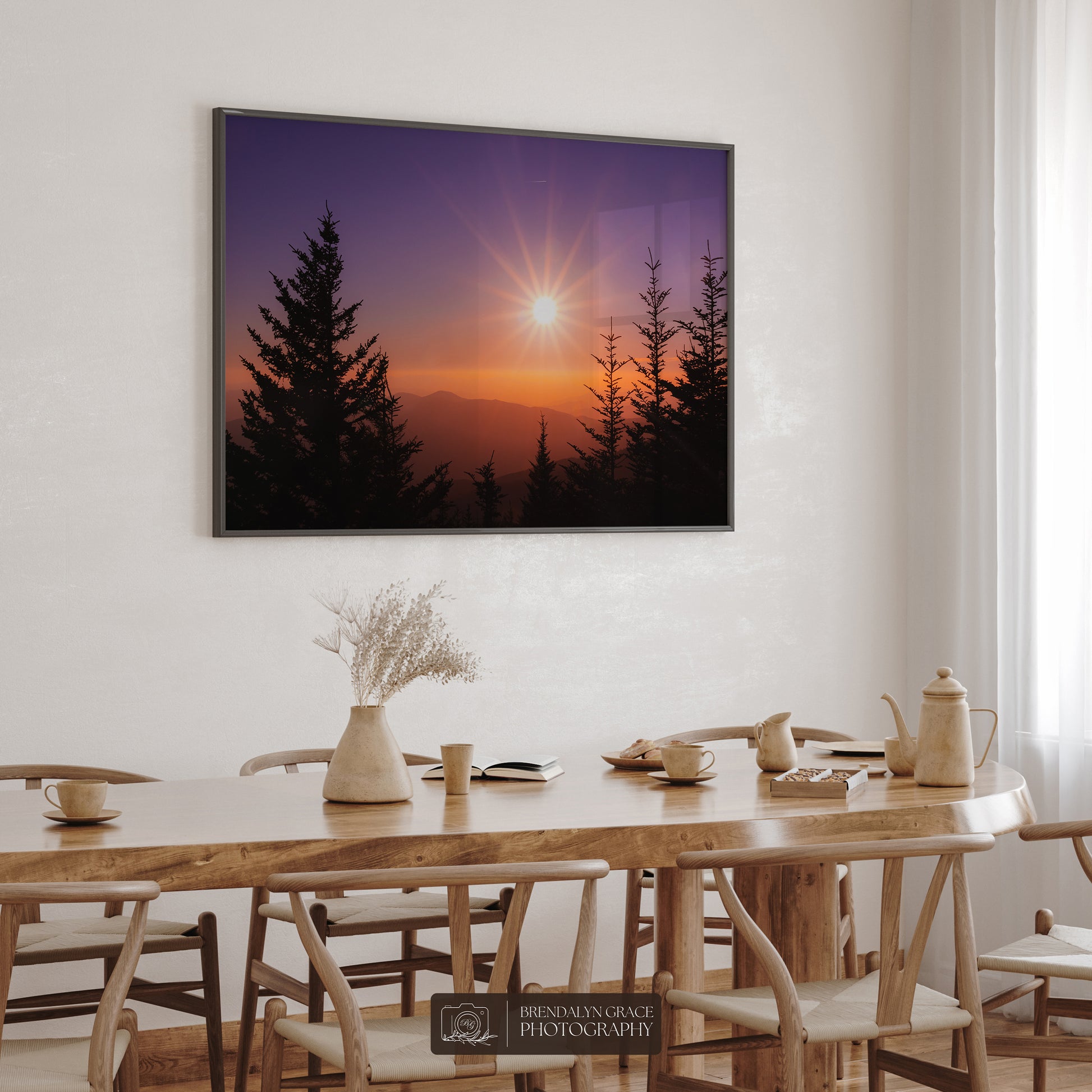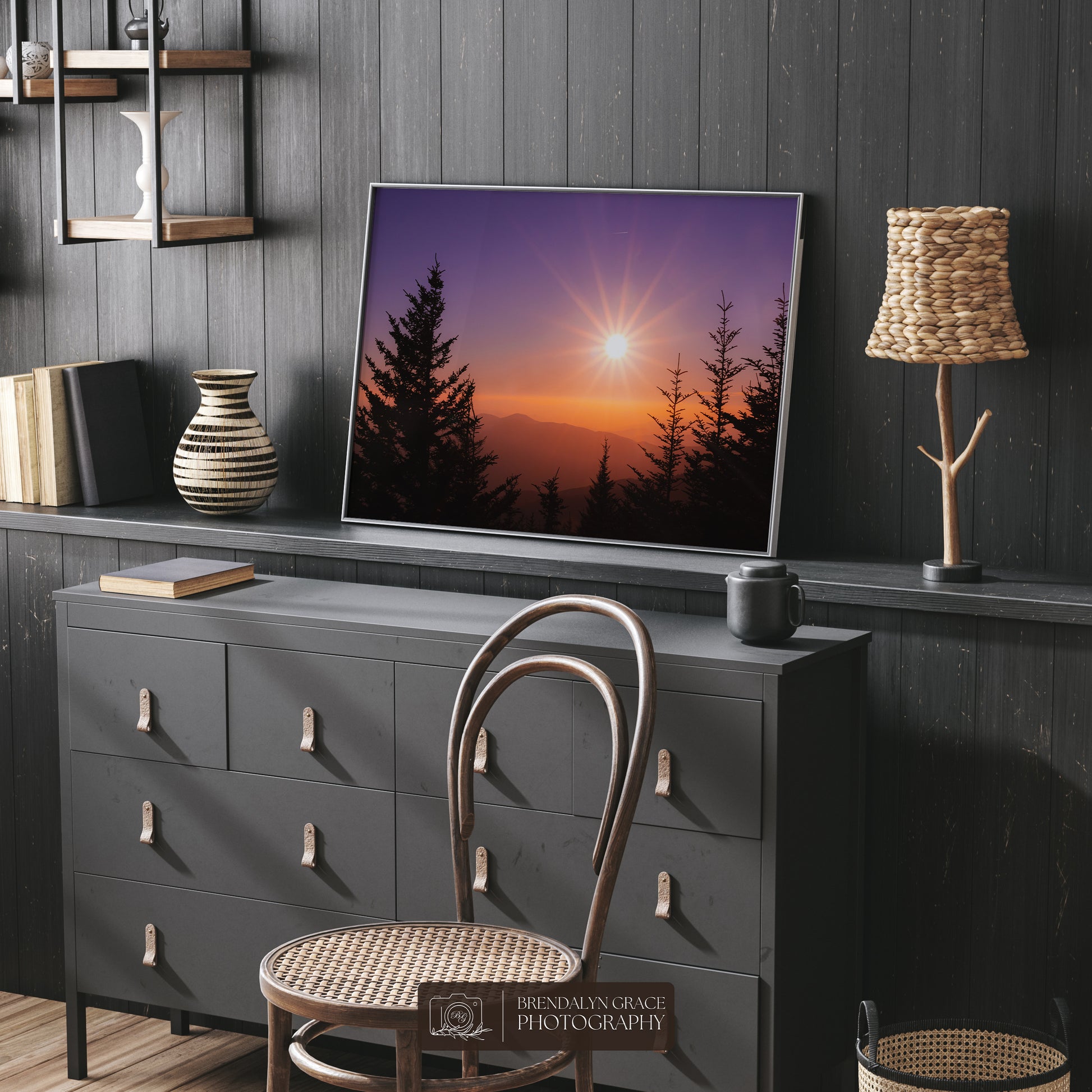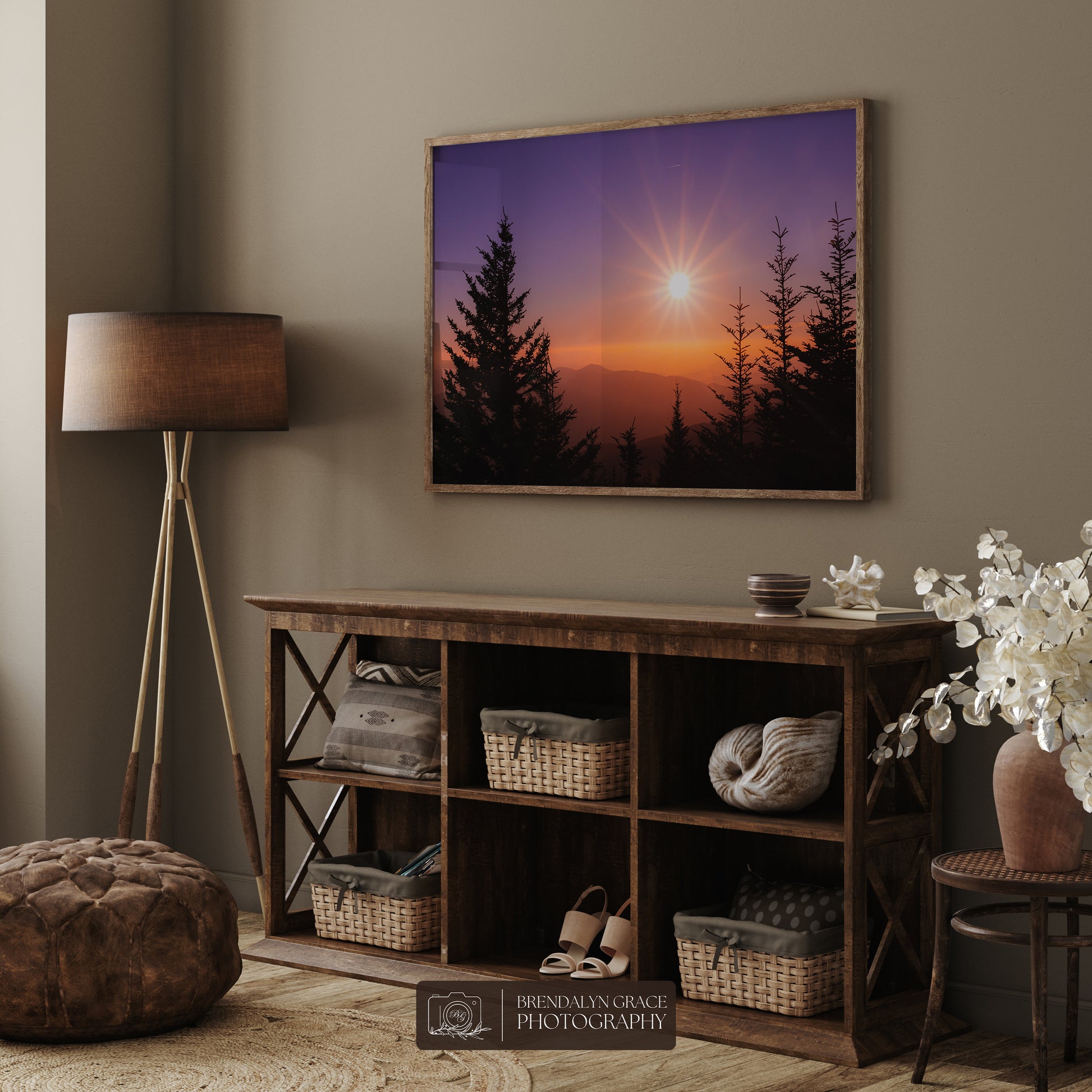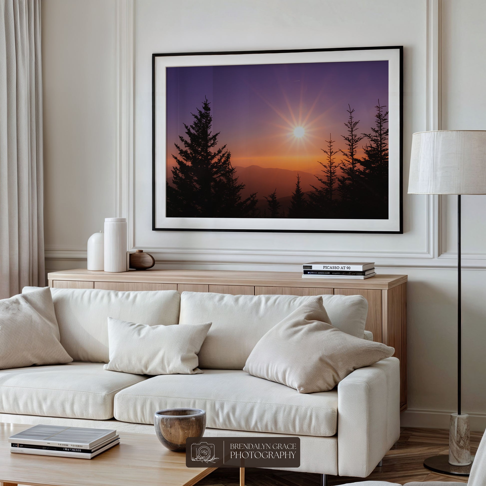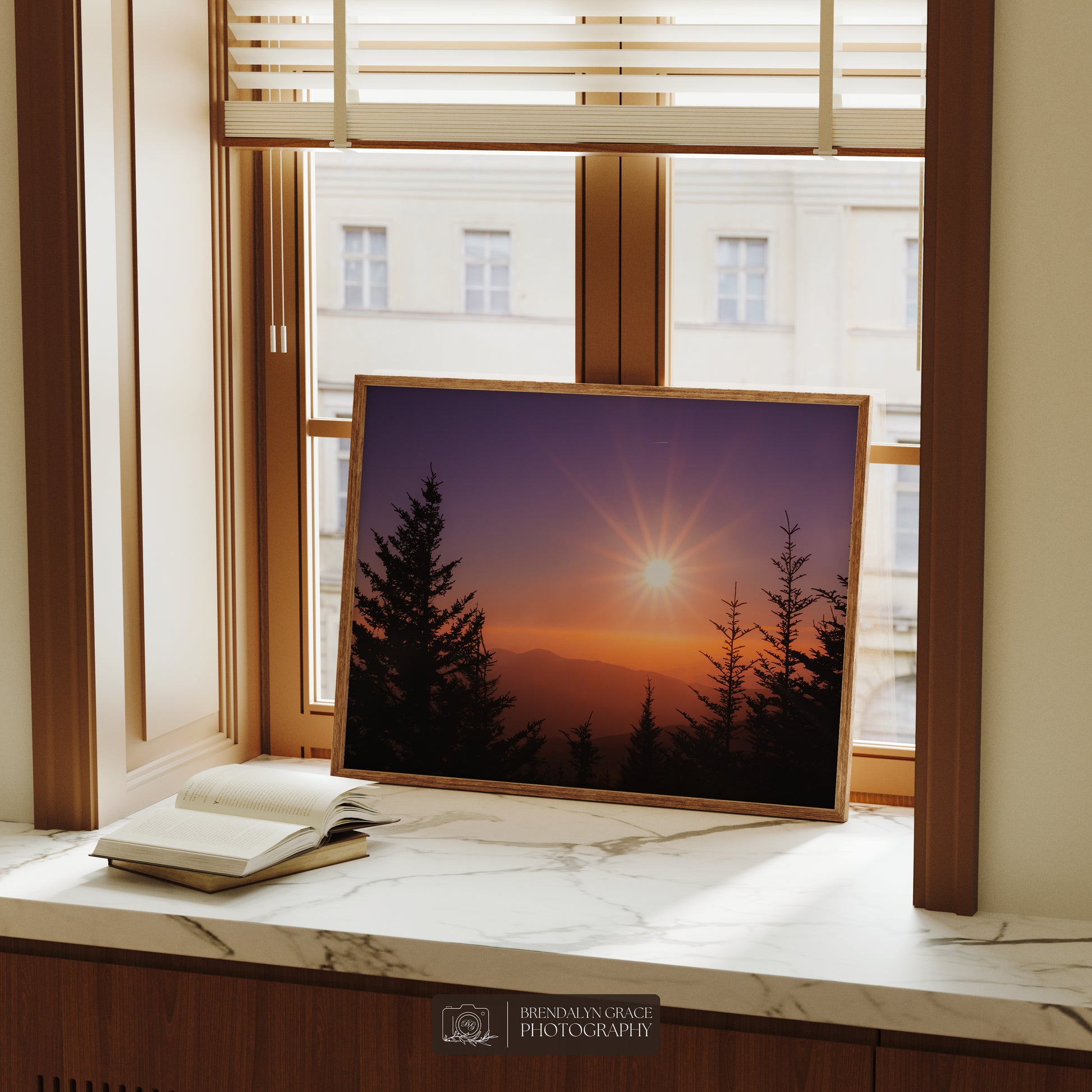 This is a print of a stunning sunset through the trees and over the mountains of the Great Smoky Mountains National Park, USA. This picture was taken on October 29th of 2023, in the parking lot at Clingman's Dome in the park.