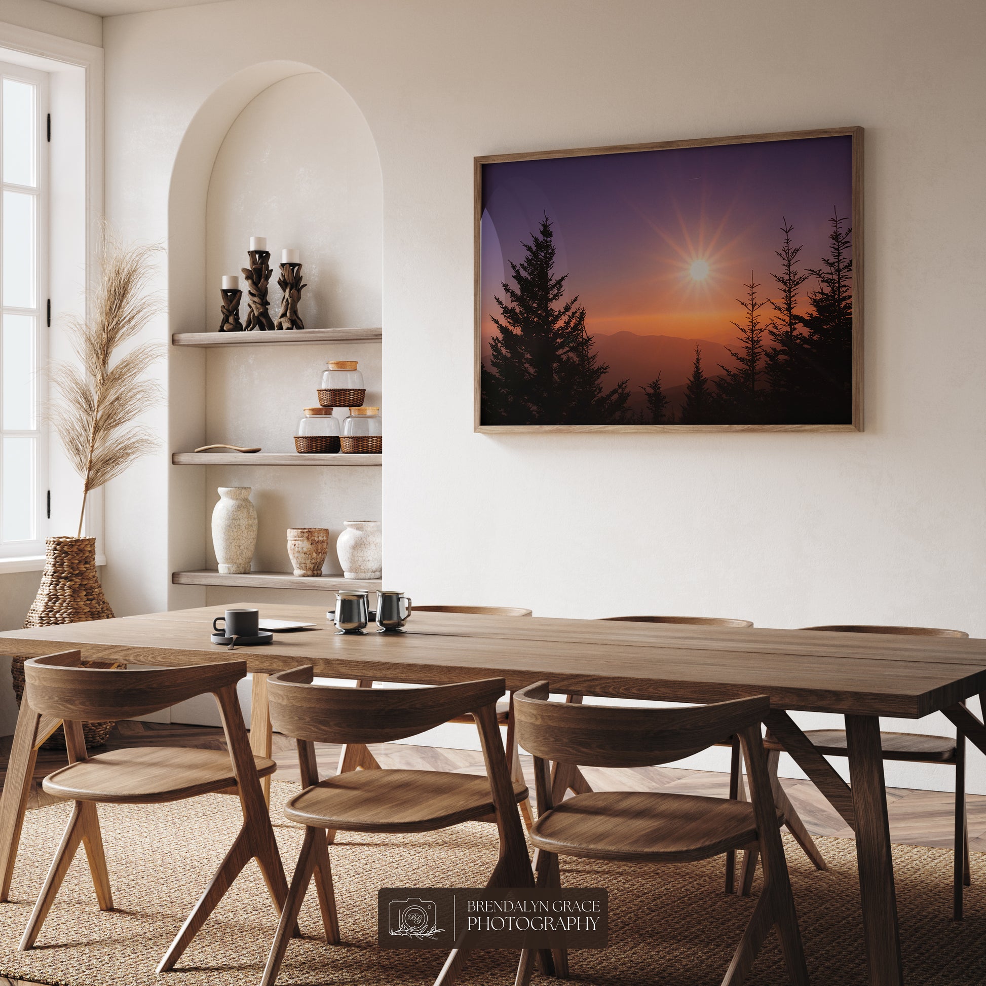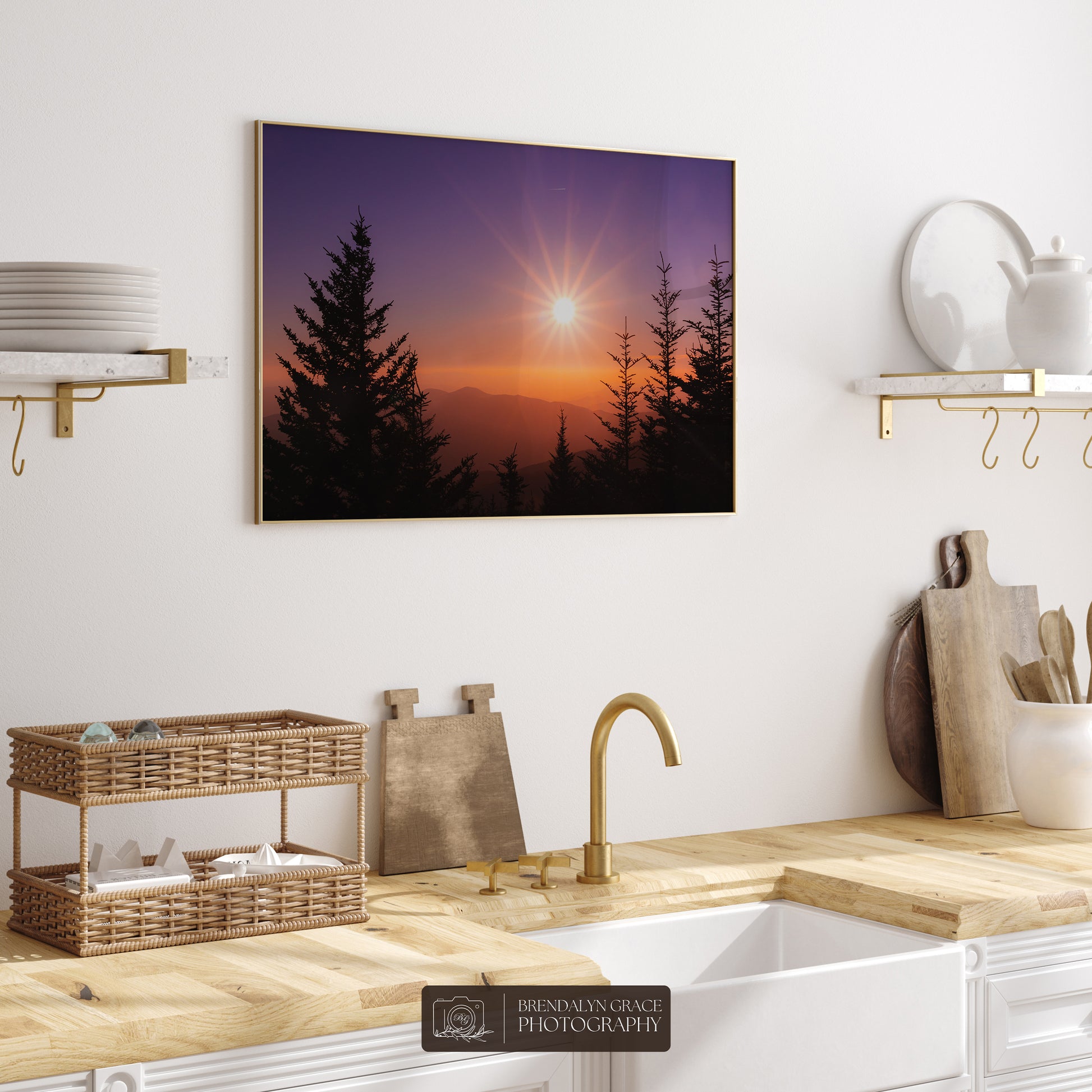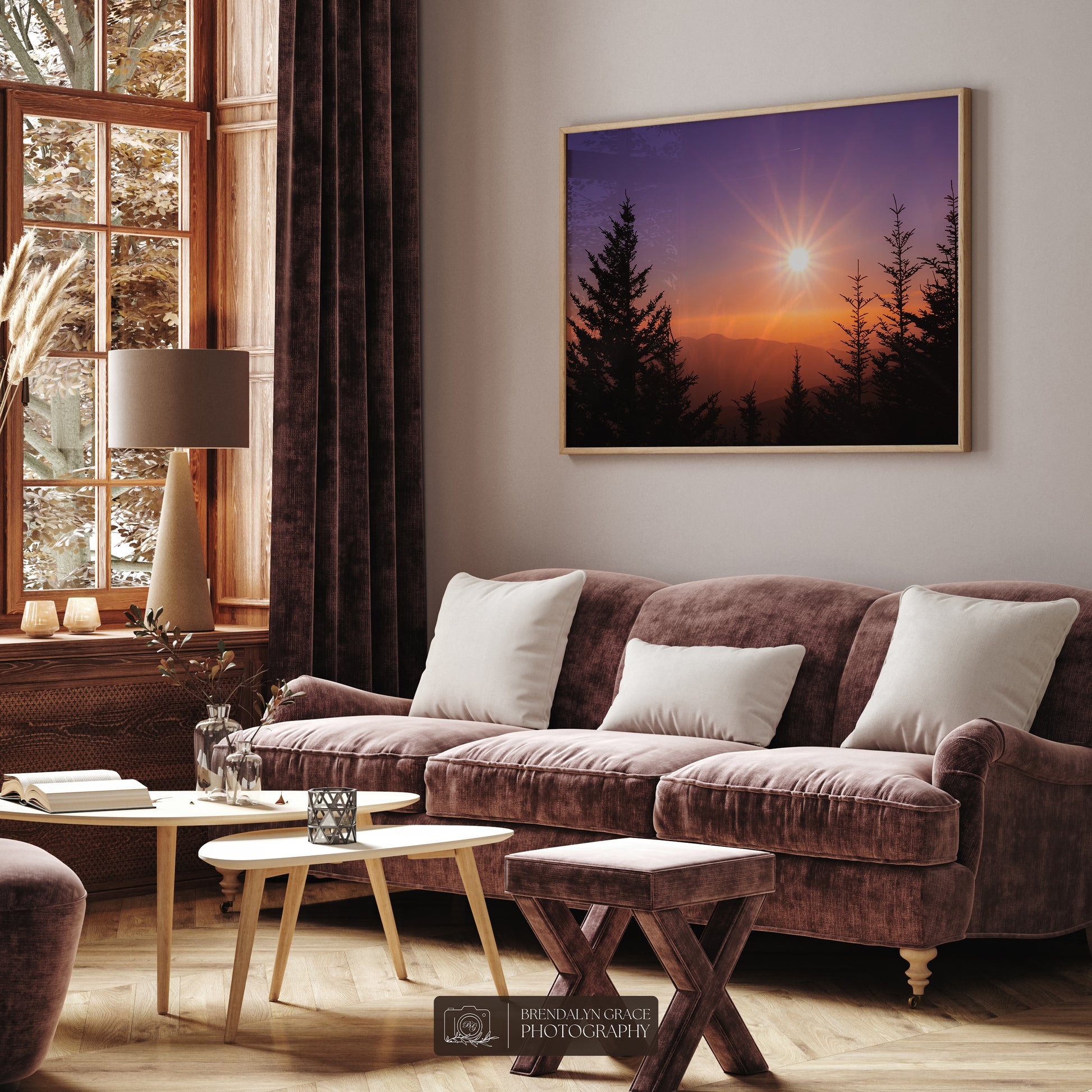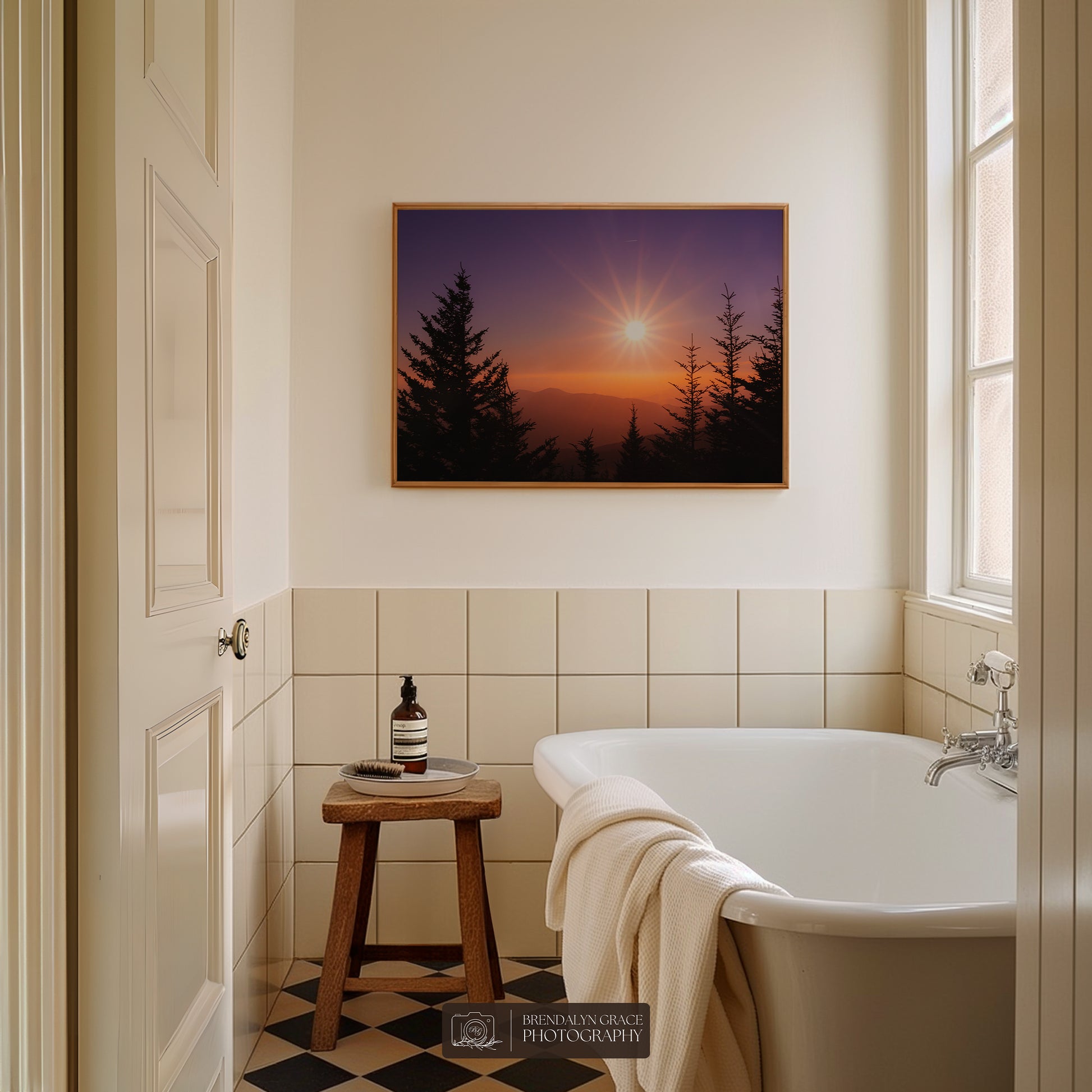 This is a print of a stunning sunset through the trees and over the mountains of the Great Smoky Mountains National Park, USA. This picture was taken on October 29th of 2023, in the parking lot at Clingman's Dome in the park.